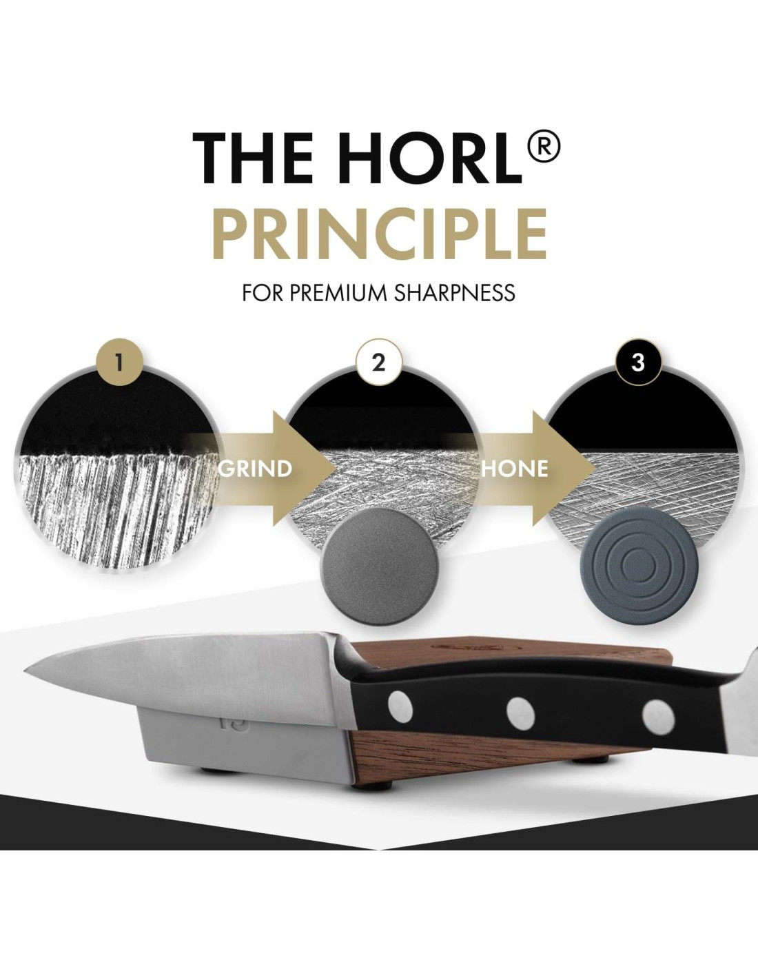 - El afilador HORL2 tiene la flexibilidad para satisfacer los requisitos individuales en el afilado de cuchillos con discos de afilado intercambiables y un soporte de ángulo magnético con un ángulo de 15 para un borde fino y un ángulo de 20 para una hoja robusta.