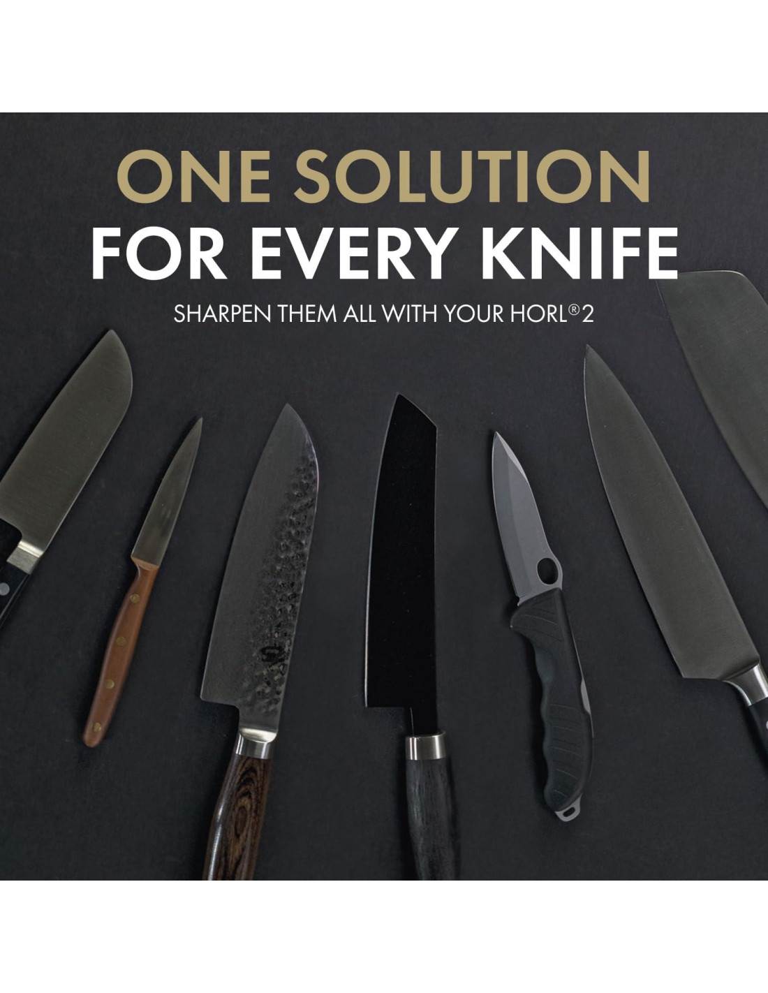 - El sistema de afilado HORL2 combina discos de diamante y cerámica para afilar cuchillos de cualquier dureza, incluidos cuchillos de cocina europeos, acero duro o blando, aceros inoxidables y resistentes a la corrosión, y cuchillos de exterior. Los diamantes industriales utilizados son los abrasivos más duraderos y eficientes.