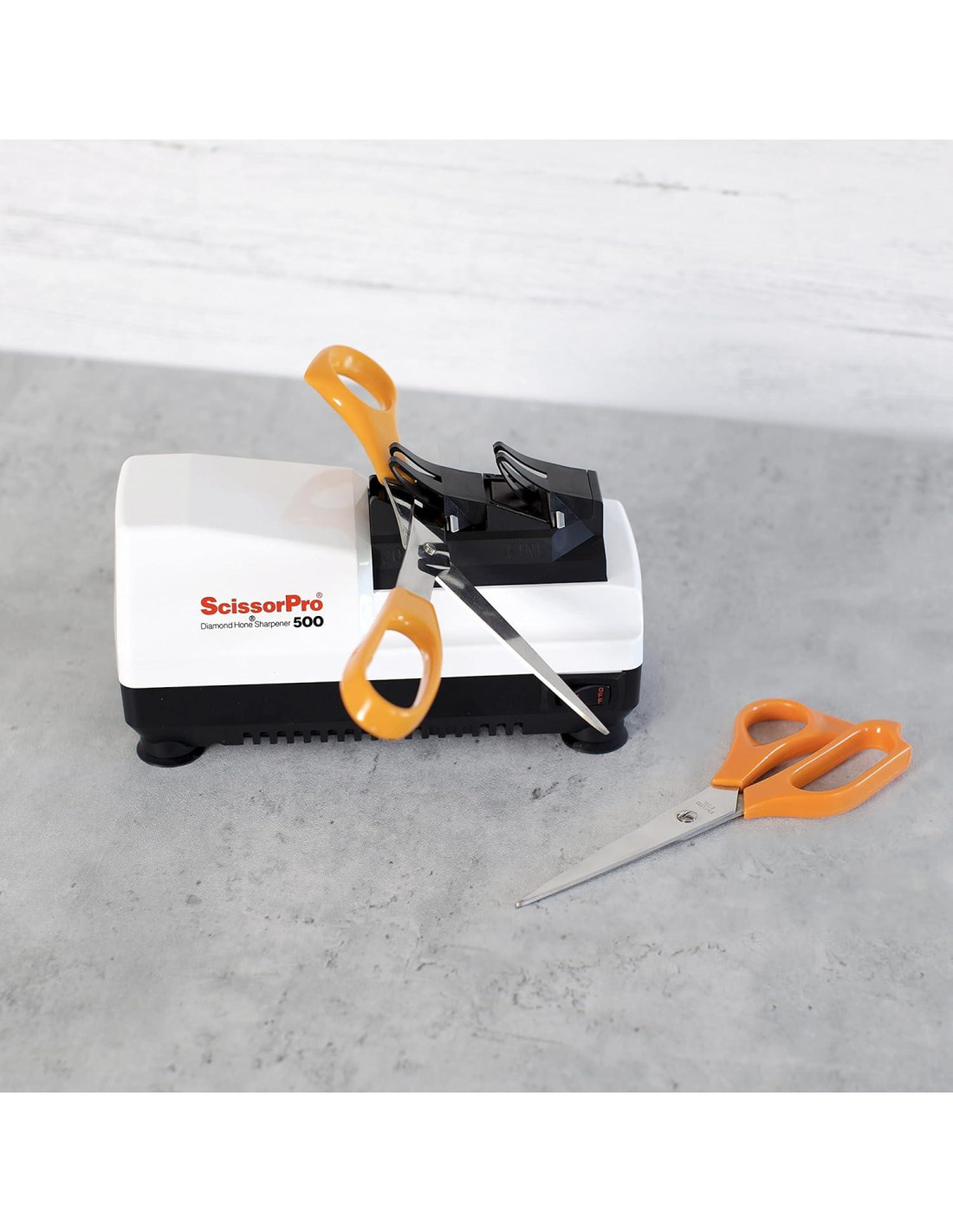 Descripción del Producto Imagina tijeras super afiladas todo el tiempo! El afilador eléctrico ScissorPro utiliza abrasivos de diamante 100% y guías de ángulo de precisión integradas para ayudarte a aplicar bordes de calidad profesional de manera rápida y fácil. Afile una amplia variedad de tijeras domésticas, incluyendo tijeras de bordado delicadas, tijeras de filo de cuchillo e incluso tijeras para aves! Seguro para tijeras de calidad. No se requiere desensamblar las tijeras. Puede ser utilizado para tijeras de mano izquierda o derecha. ¡Nunca más tendrás que perder tiempo y dinero enviando tijeras a afilar! Presenta un diseño robusto y compacto. Diseñado y ensamblado en EE. UU. No está destinado para tijeras de barbero, tijeras de zigzag o tijeras de borde festoneado. Amazon.com Este afilador de tijeras para el hogar añade un borde de nivel profesional a una amplia variedad de tijeras, desde tijeras domésticas y de costura, hasta tijeras de cocina y tijeras para atar moscas, sin requerir que el usuario desmonte las cuchillas. El ScissorPro independiente cuenta con dos ranuras de afilado, cada una con un disco curvado recubierto de abrasivos de diamante. Un disco ofrece un afilado fino para formar un borde afilado como una navaja durante la primera etapa de afilado y el otro un afilado grueso para afilar o afilar en un ángulo más amplio y añadir los toques finales. Una construcción patentada de imanes y resortes de plástico que el fabricante llama tecnología Magne-Flex alinea las cuchillas de las tijeras en las guías en el ángulo correcto y proporciona la cantidad adecuada de presión y estabilidad para el afilado. Dado que los diamantes son el único elemento lo suficientemente fuerte como para afilar y pulir verdaderamente una cuchilla, esta herramienta produce resultados duraderos, incluso en cuchillas de doble bisel. Además, el movimiento rotatorio de los discos asegura que las tijeras de alta calidad no se destemperen. Las instrucciones incluidas enseñan cómo mover correctamente las cuchillas de las tijeras a través de las ranuras para obtener resultados de afilado seguros y óptimos. El afilador ScissorPro se conecta a cualquier toma de corriente de CA y está cubierto por una garantía limitada de un año. --Cristina Vaamonde