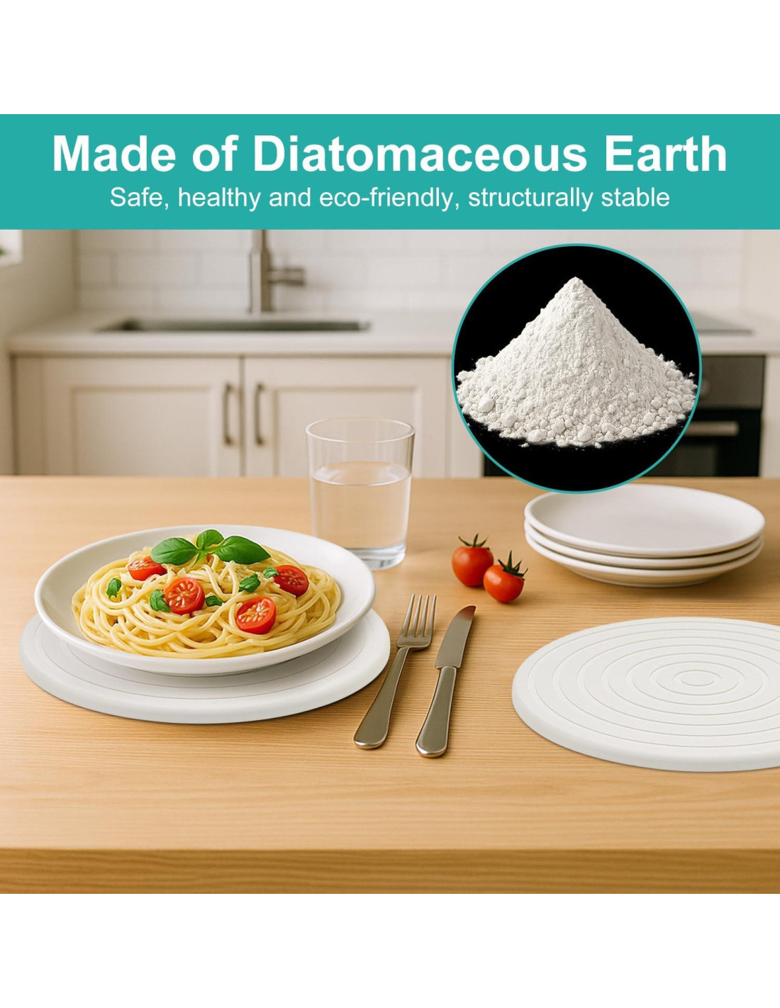 - Super Absorción de Agua: Hecho de diatomita por un material de piedra natural. La estructura porosa de diatomita absorbe derrames y condensación al instante, manteniendo las superficies secas y limpias.