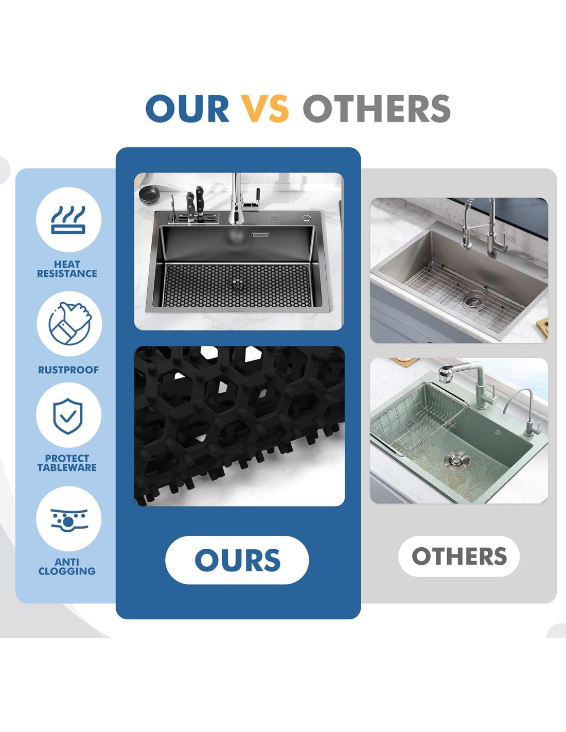 - [No Solo Protege el Fregadero] Al lavar los platos, también cubre el fondo del fregadero y protege el fregadero de acero inoxidable o cerámica de ser rayado. Además, a diferencia del acero inoxidable, la alfombrilla de silicona para fregadero de cocina también proporciona un cojín para utensilios frágiles, evitando que se rompan accidentalmente. En resumen, los protectores de fregadero de silicona brindan seguridad para tus utensilios de cocina!