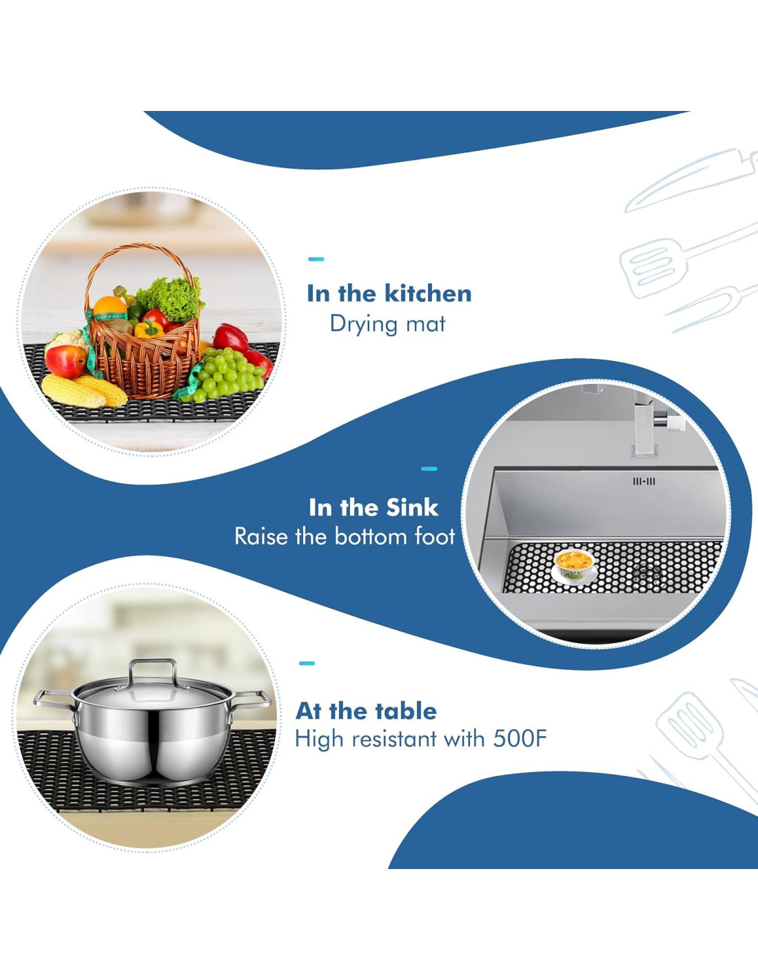 - [Resistencia a Altas Temperaturas] La Alfombrilla y Protectores para Fregadero de Cocina pueden soportar hasta 500 F (260 C). Así que puedes colocar de manera segura ollas y platos en la alfombrilla del fregadero directamente del horno o la estufa. También se utiliza como rejilla de secado, escurridor de vajilla, rejilla de drenaje, rejilla de enfriamiento, rejilla de descongelación, etc.