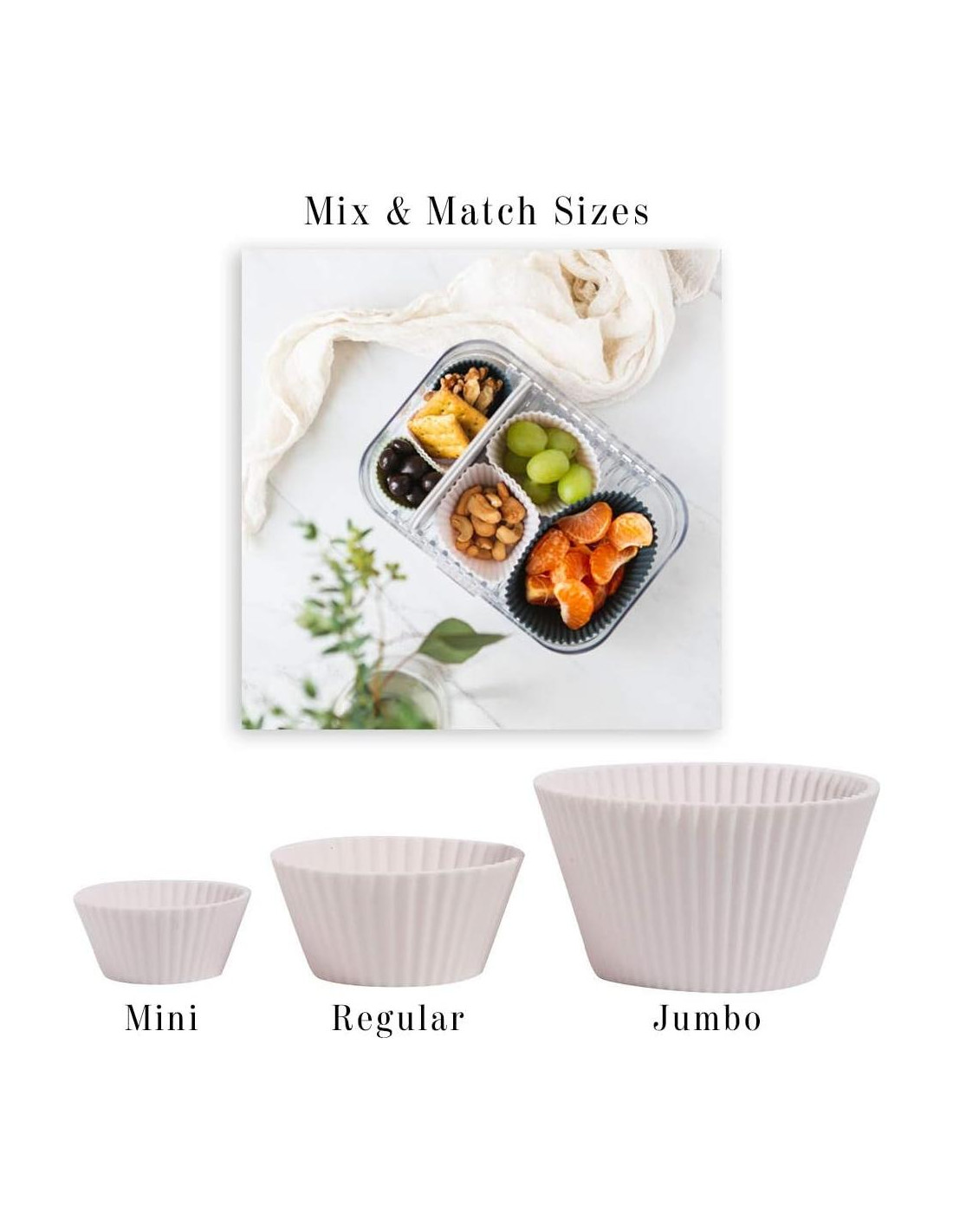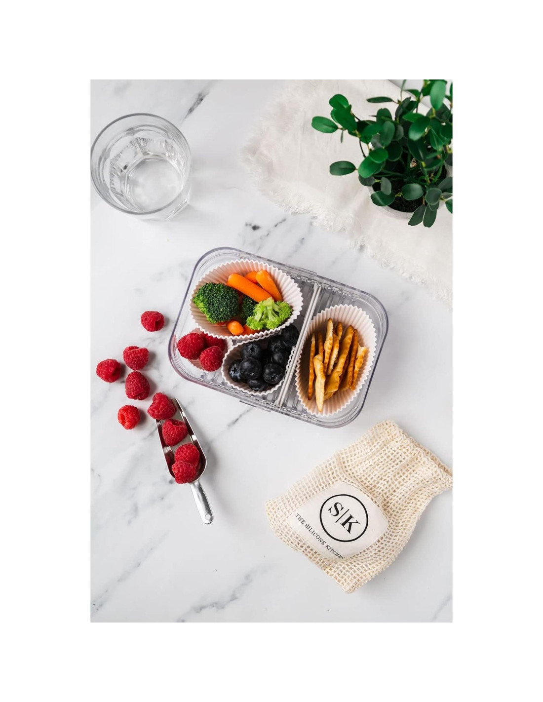 Separa alimentos, bocadillos, salsas y más en tu caja de almuerzo. Los tazones de hornear de silicona de La Cocina de Silicona vienen en una variedad de tamaños.