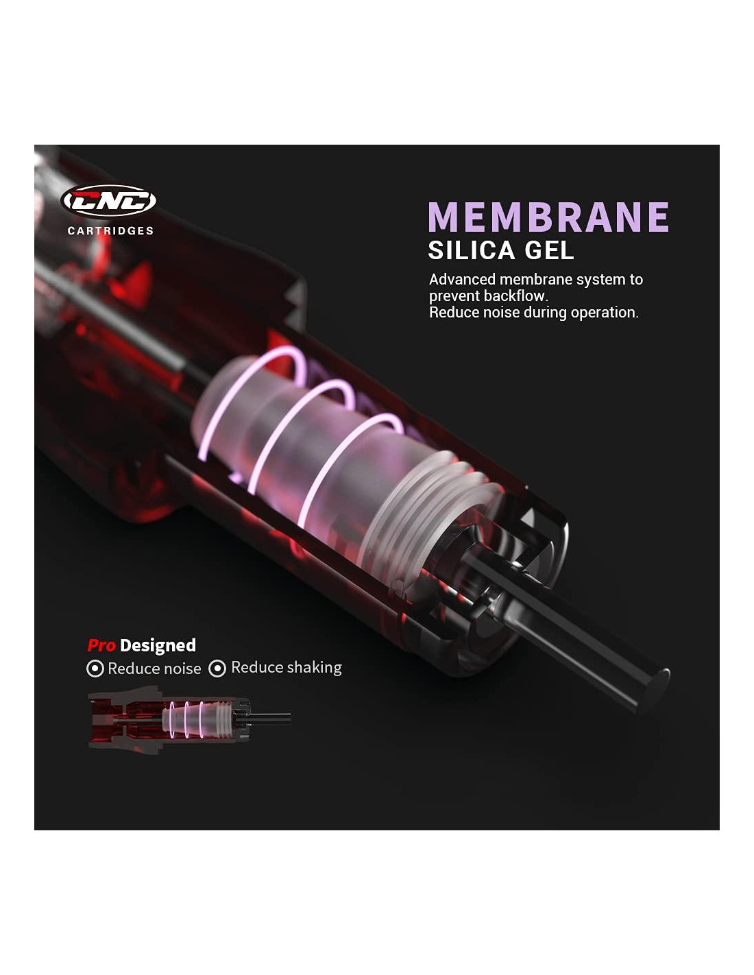 - Las agujas de cartuchos CNC están equipadas con una membrana segura, que asegura que ninguna tinta o sangre pueda filtrarse en la empuñadura. Agregamos un estabilizador para detener el movimiento y crear un trabajo preciso.