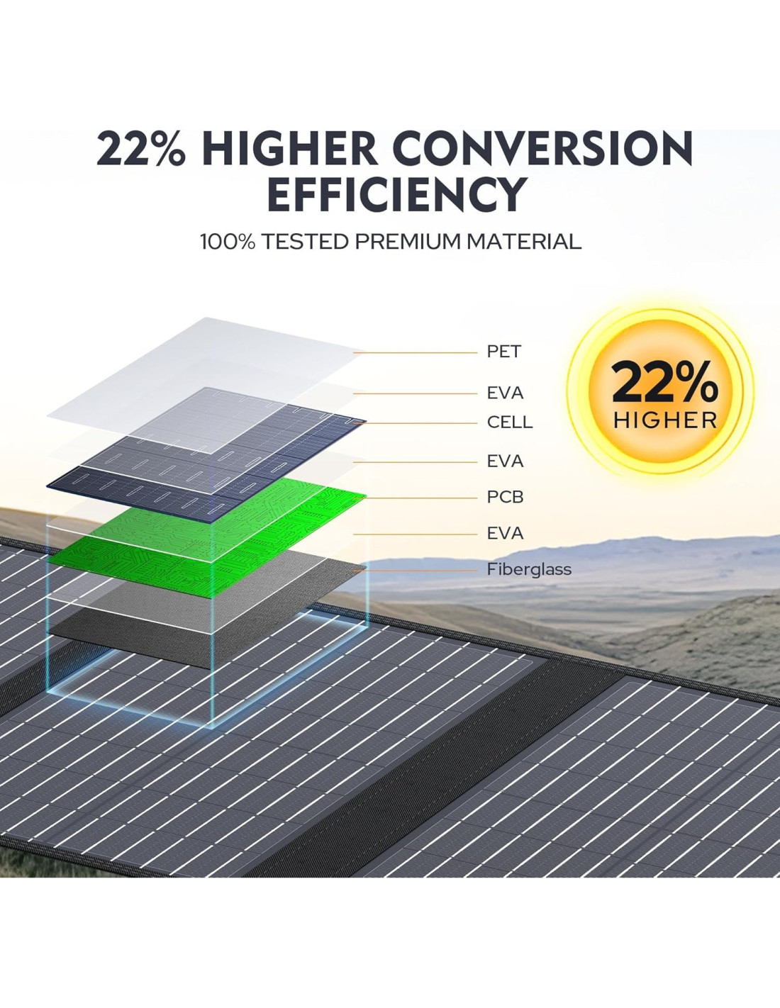El panel solar plegable de 60W está hecho de material de silicio monocristalino con una eficiencia de conversión de hasta el 22%. El panel solar portátil de 60W produce más energía en cualquier clima que los paneles solares tradicionales, e incluso funciona mejor en días nublados o fríos. El panel solar plegable de 60W está hecho de material de silicio monocristalino con una eficiencia de conversión de hasta el 22%. El panel solar portátil de 60W está hecho de material de silicio monocristalino con una eficiencia de conversión de hasta el 22%. Y es compatible con la mayoría de los generadores solares y estaciones de energía portátiles en el mercado. Perfecto para la vida al aire libre y escenarios como cortes de energía inesperados.