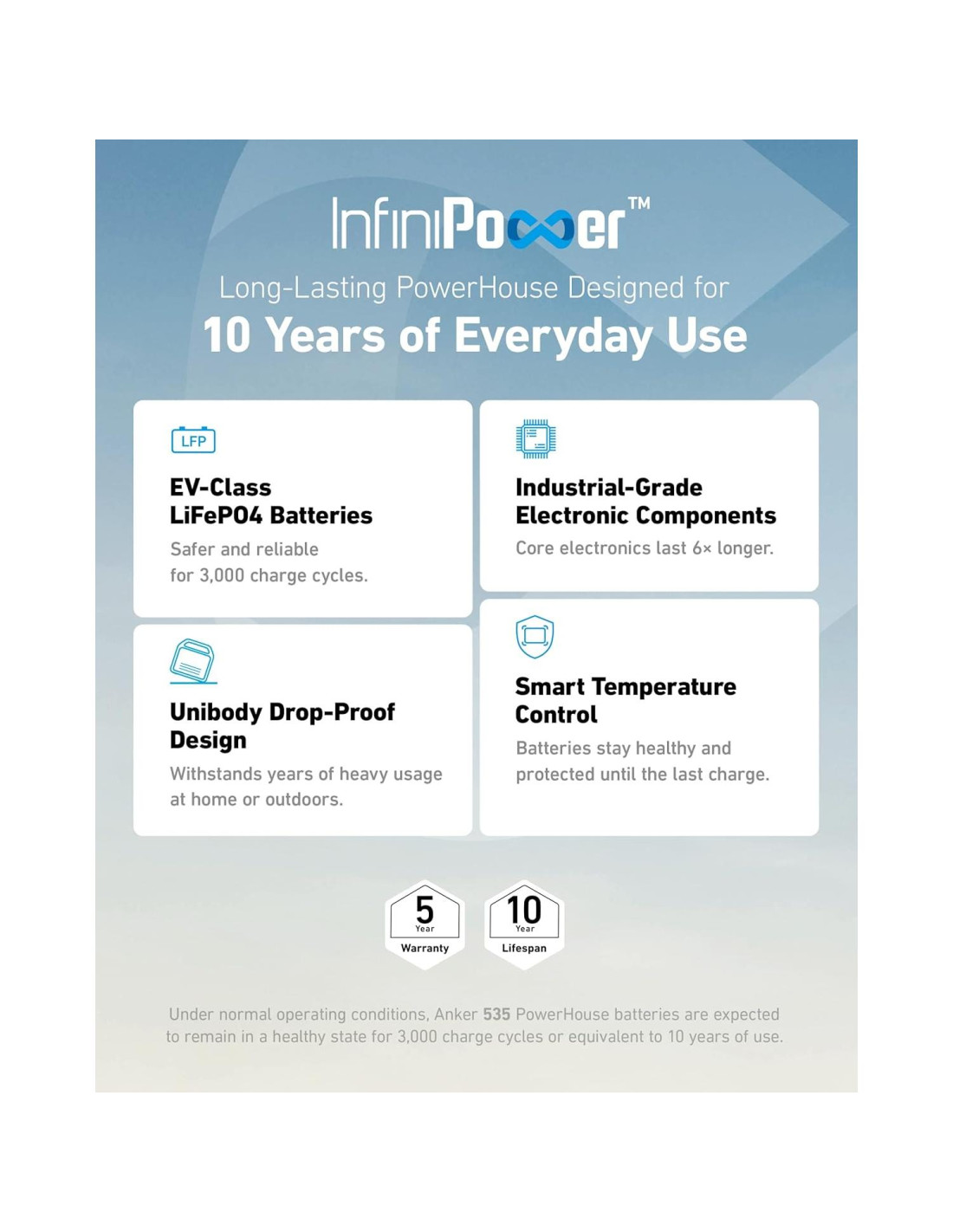 - Estación de Energía Portátil de Larga Duración con una Vida Útil de 10 Años: Con nuestra tecnología patentada de larga duración InfiniPower, combinada con baterías LiFePO4, componentes electrónicos ultra duraderos, un sistema de control de temperatura inteligente que monitorea la temperatura hasta 100 veces por segundo, y un diseño estructural resistente a impactos, Anker 535 PowerHouse está construido para durar más de una década, incluso con uso diario.