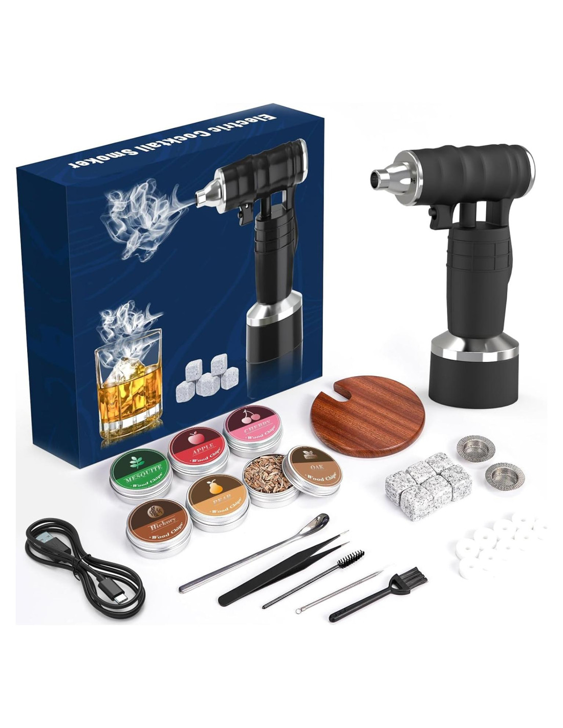 - EL JUEGO DE AHUMADO DE WHISKEY BOURBON CONTIENE: Máquina de Ahumado de Cócteles (incluyendo base de calor de cerámica) x 1; Kit de Limpieza (cepillo grande, cepillo pequeño, varilla de limpieza de acero inoxidable) x 1; Colador de Acero Inoxidable x 2; Filtros de Algodón para Grasa x 10; Tapa de Taza de Madera Redonda x 1; Cuchara de Acero Inoxidable Plateada x 1; Pinzas Negras x 1; Cable de Carga x 1; Piedras de Whisky x 6; 6 Sabores Diferentes de Astillas de Madera en Cajas de Aluminio (Manzana; Cereza; Roble; Pera; Nogal; y Mesquite).