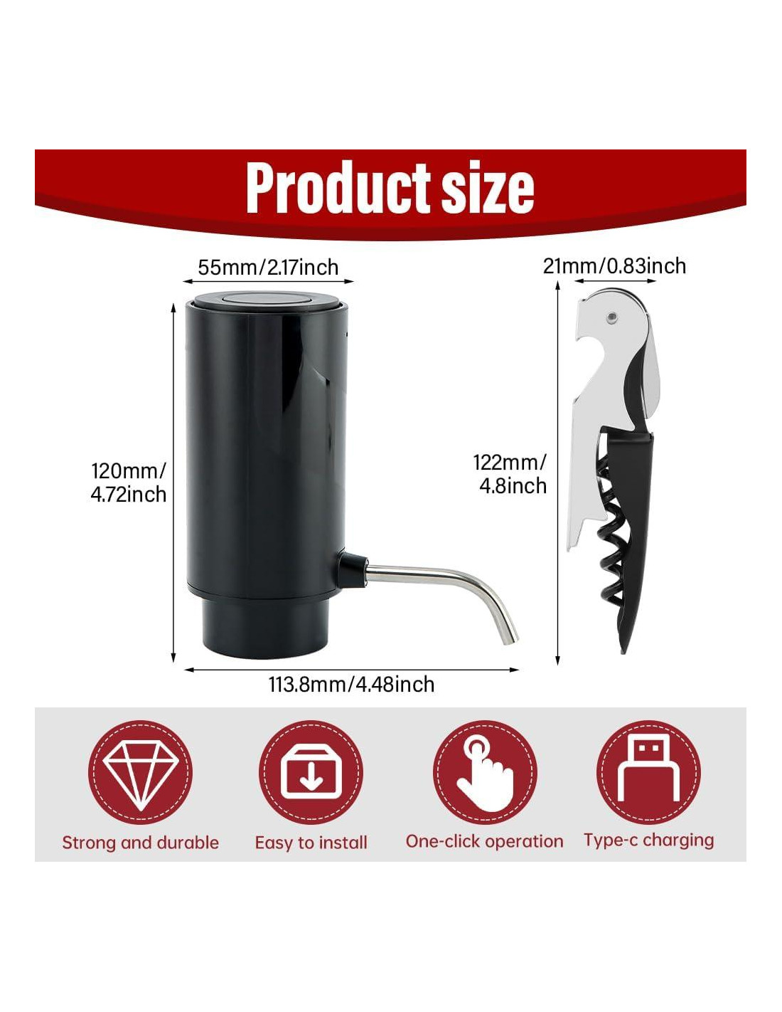 - [Carga Rápida y Duradero] Olvídate de recargar constantemente: nuestro dispensador de vino con batería incorporada asegura una carga rápida tipo C para airear más de 30 botellas.