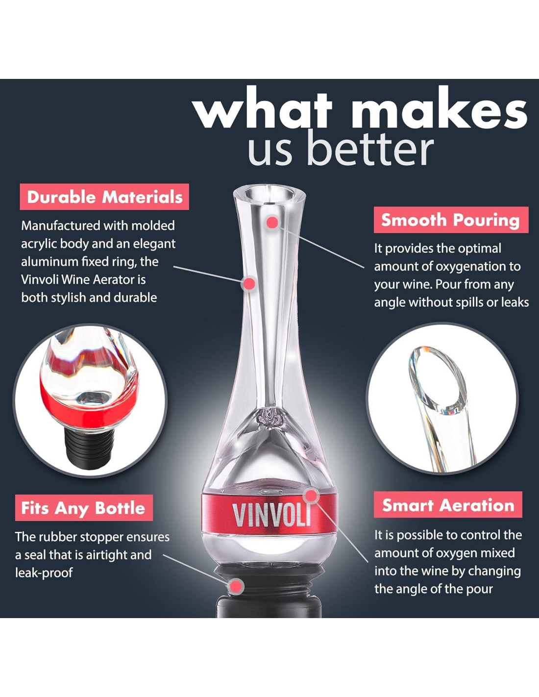 - [Prueba el Aerador de Vino Definitivo] Obtén una maravillosa experiencia de beber vino con el Vertedor de Vino Vinvoli. Suaviza los taninos, alisa el final de tu vino y proporciona un bouquet perfecto de aroma