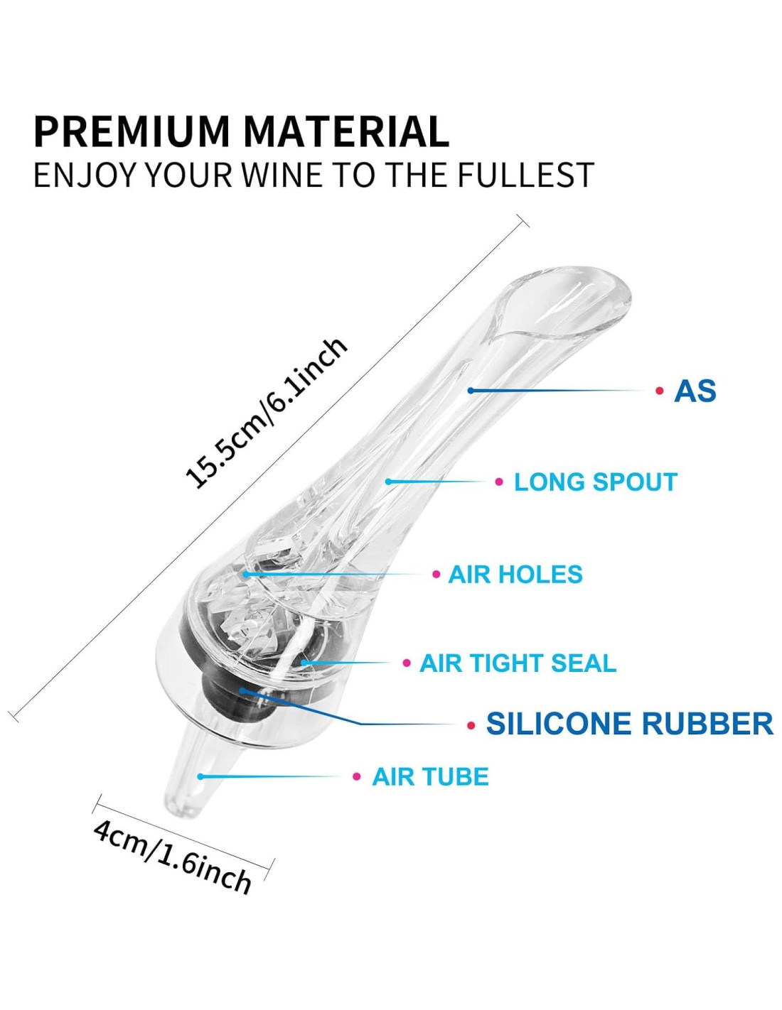 - Efecto Bernoulli - Mejore el sabor. El aireador está diseñado con tres orificios de aire. Cuando el vino en la botella fluye rápidamente y pasa a través de los orificios de aire, la presión dentro de la botella disminuye, y una gran cantidad de aire del exterior de la botella entra rápidamente en el aireador y entra en contacto total con el vino que fluye. Para lograr el efecto de suavizar los taninos, aumentar el color y restaurar el sabor original suave y meloso del vino.
