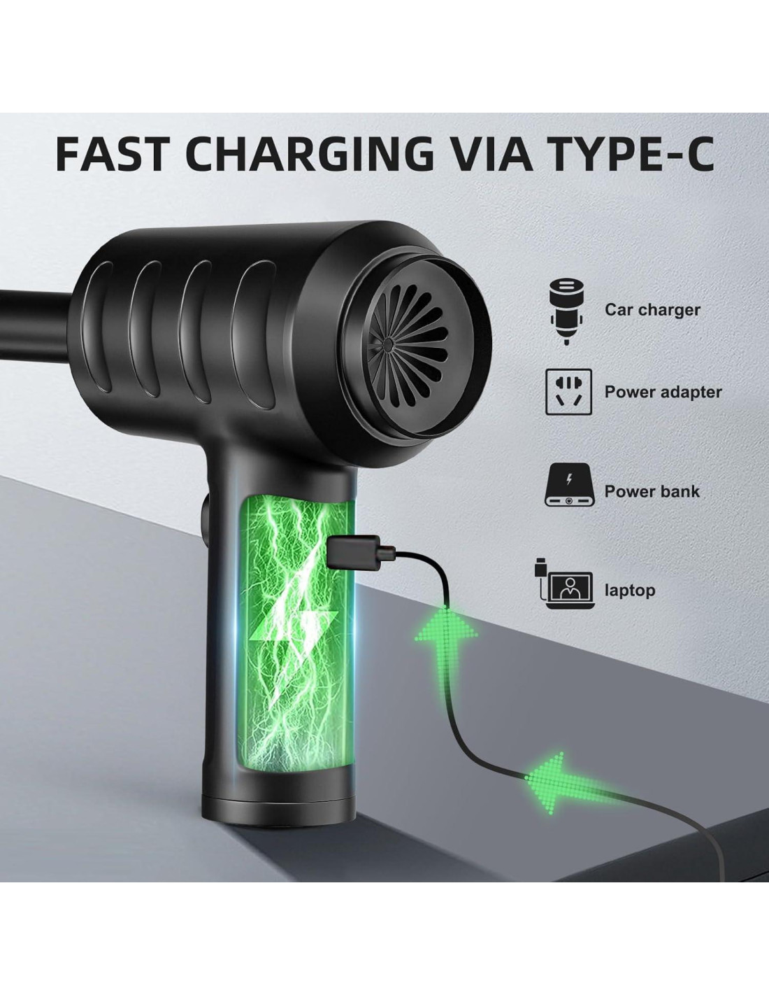 - Larga Duración y Carga Rápida: El soplador de aire inalámbrico tiene una batería de 6000mAh incorporada, que puede funcionar continuamente durante hasta 35 minutos. Viene con cable de carga rápida USB-C, completamente cargado en 3-4 horas