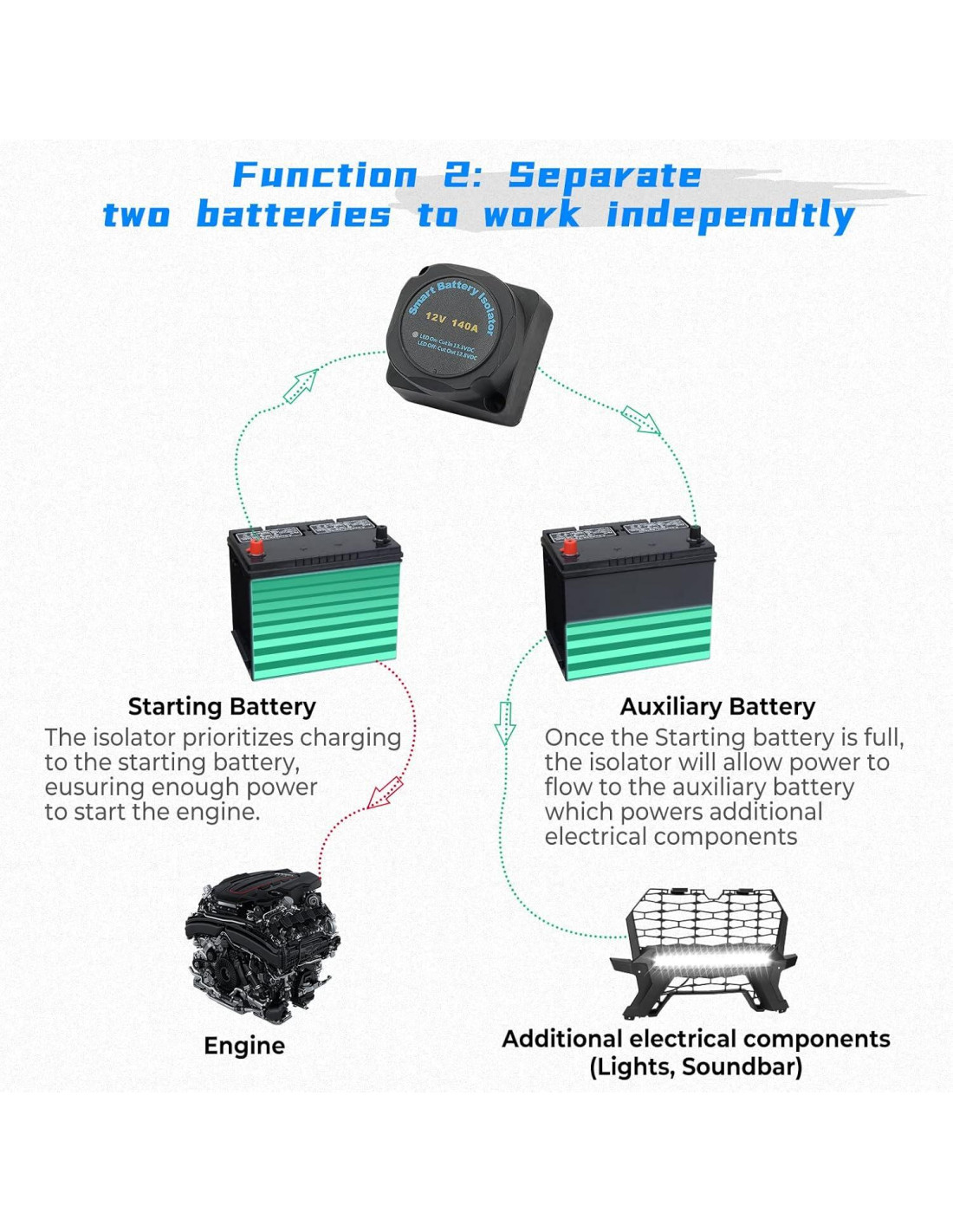 - [Dos Fuentes de Energía Separadas] El Aislador de Batería Doble de 12V 140Amp separa dos baterías entre sí para proporcionar energía de manera independiente: Batería de Arranque para el motor para arrancar el coche y Batería Auxiliar para partes eléctricas adicionales como luces, aire acondicionado, etc.