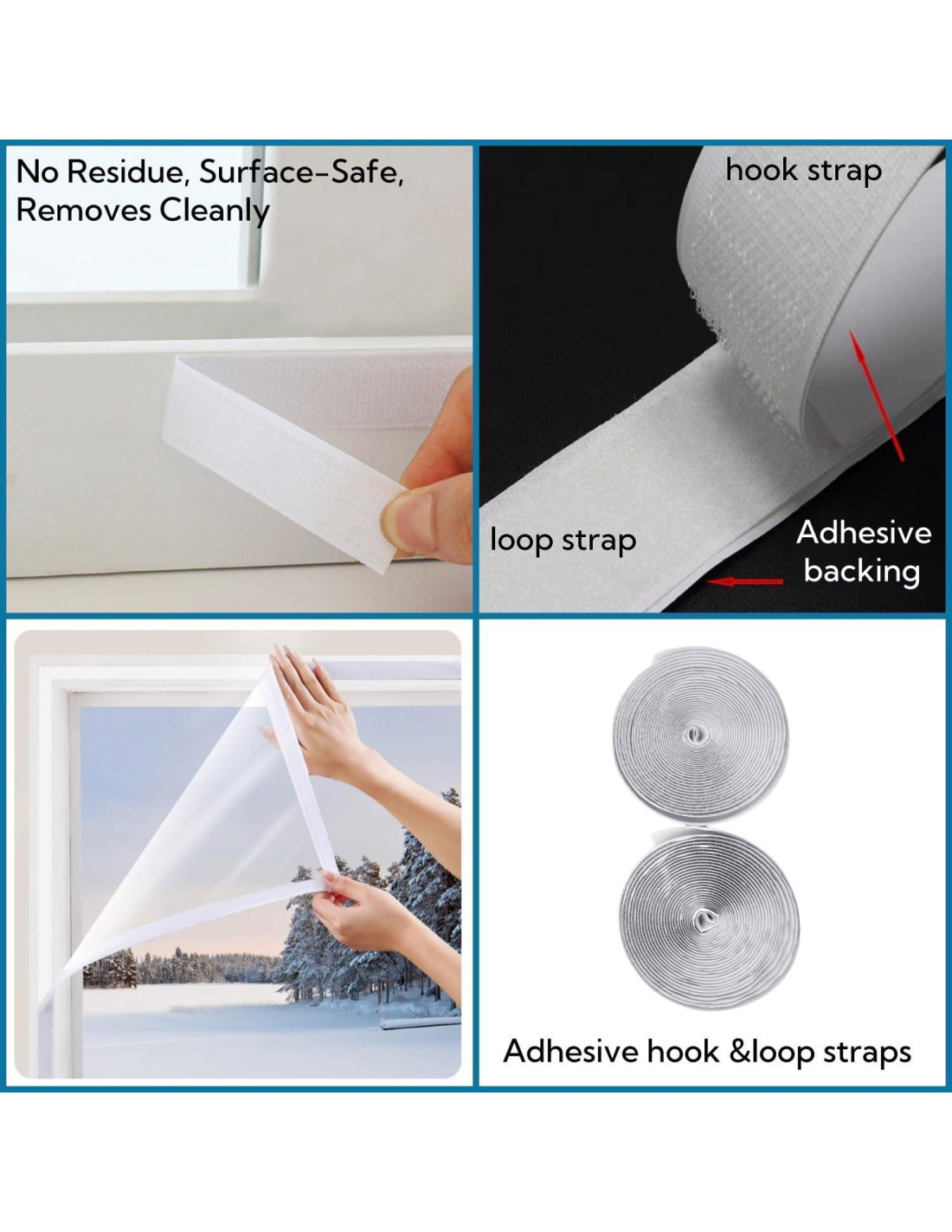 - [Contenido del Producto] : Incluye una pieza de película transparente 47"x63"(120X160cm), un rollo de correas adhesivas de bucle (longitud de 19.5 pies), un rollo de correas adhesivas de gancho (longitud de 19.5 pies) y un manual dentro.