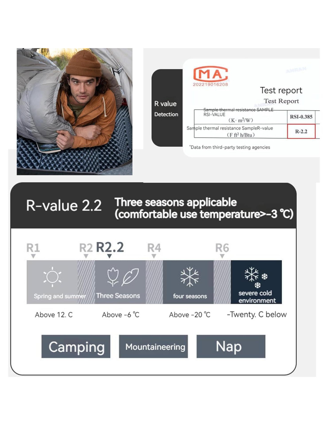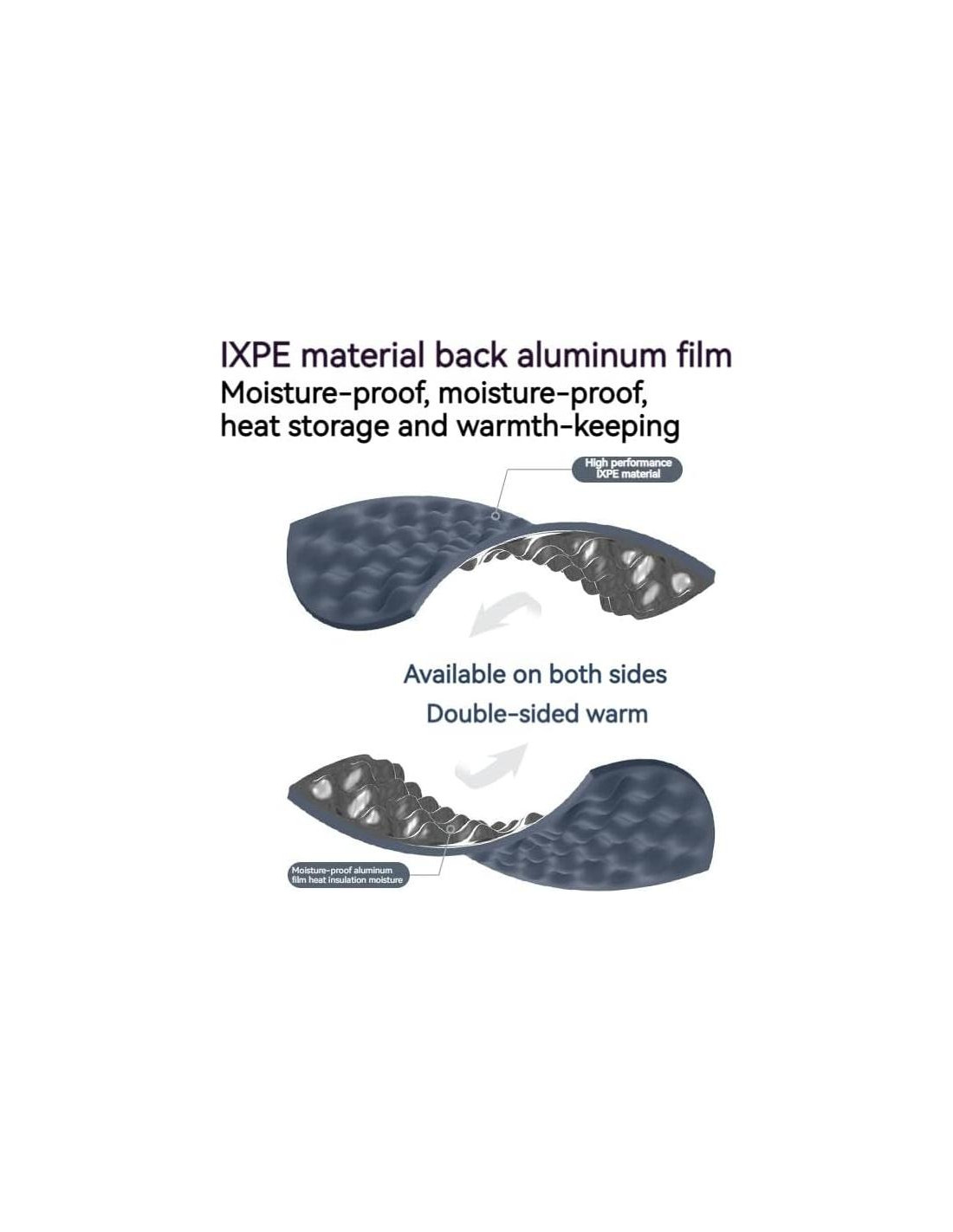 - A Prueba de Humedad y R-valor 2.2 para tres estaciones: película de aluminio resistente a la humedad para aislamiento y retención de humedad. Ambos lados se pueden usar, en temperaturas más frías, es mejor usar el lado plateado para mantener el frío fuera. R-valor 2.2 para tres estaciones (temperatura de uso cómoda > -3C)
