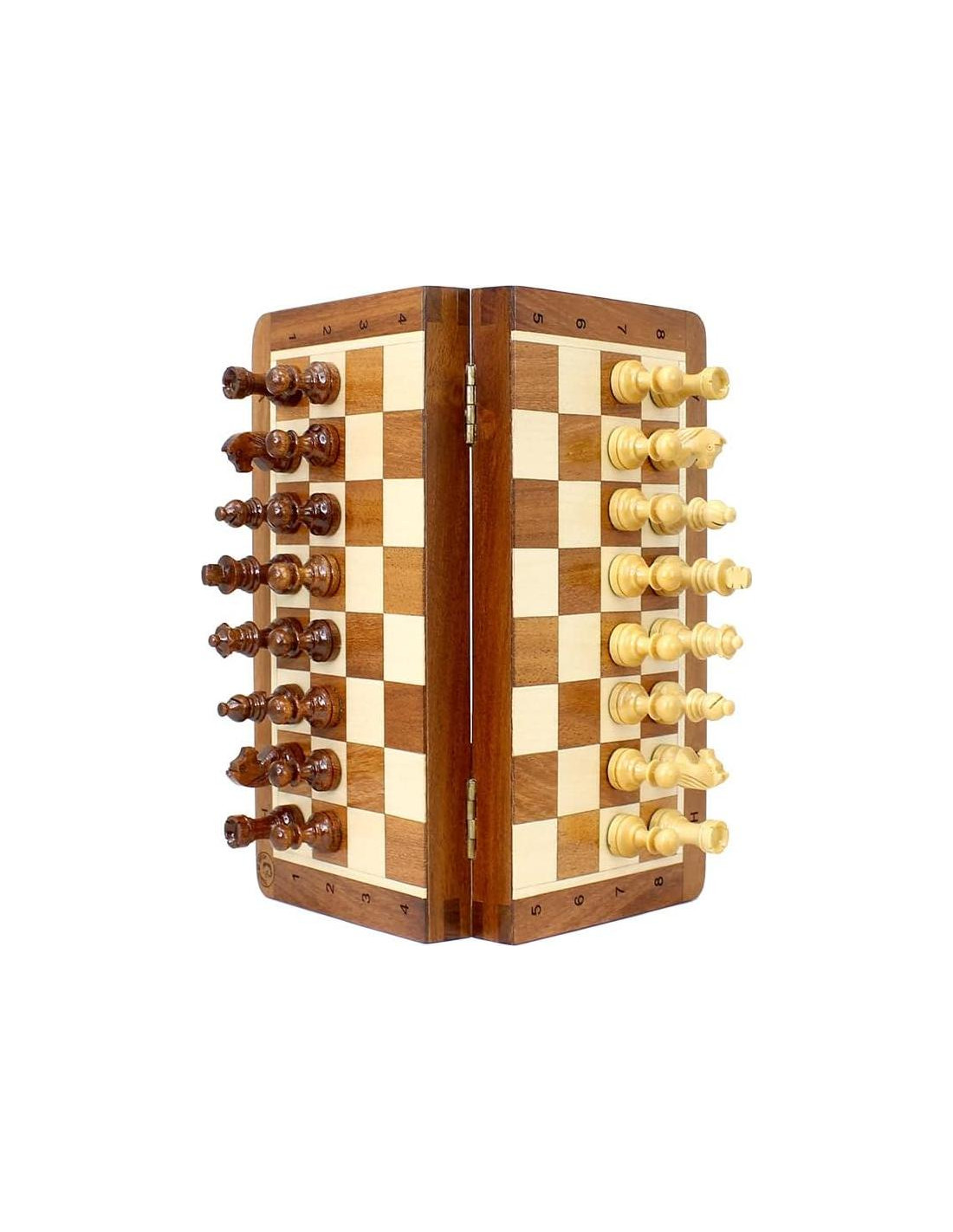 Casa de Ajedrez presenta un juego de ajedrez de viaje plegable magnético de madera hecho a mano. El tablero de ajedrez incrustado ha sido fabricado mediante un proceso especial de incrustación. La superficie del tablero de ajedrez/caja y las piezas de ajedrez están terminadas y protegidas por tres capas de laca catalizada con acabado satinado que proporciona protección contra derrames y desgaste general. Especificaciones del juego de ajedrez: Combinación de Madera del Tablero de Ajedrez - Madera de Acacia / Arce Tamaño de Cuadro del Tablero - 0.87" (22 mm) Tamaño del Tablero (L x A) - 8" x 8" (20.32 cm x 20.32 cm) Peso del Tablero de Ajedrez / Caja (con Piezas) - 528 gramos (1.164 lbs) Especificaciones de las piezas de ajedrez: Altura del Rey - 1.38" (35 mm) Base del Rey - 0.55" (14 mm) Combinación de Madera de las Piezas de Ajedrez - Madera de Acacia / Madera de Boxwood Las piezas de ajedrez de madera están talladas a mano en diseño Staunton. Un delgado fieltro de terciopelo verde suave se ha aplicado en la parte inferior de las piezas de ajedrez. Cada pieza de ajedrez encaja en el Inserto especial que ha sido hecho de acuerdo con la forma de la pieza de ajedrez. El inserto está hecho de espuma EP especialmente destinada a la protección de las piezas de ajedrez. Se han insertado imanes dentro de cada pieza de ajedrez y la potencia del imán pasa a través del tablero de madera atraído por la hoja de metal que sostiene las piezas de ajedrez firmemente y nunca las deja caer mientras viaja o juega. La potencia del imán no deja caer la pieza de ajedrez incluso si la caja se sostiene en posición invertida. El tablero/caja de ajedrez tiene dos bisagras en la parte posterior y un cierre en la parte frontal que sostiene la parte superior e inferior de la caja firmemente cuando la caja de ajedrez está plegada. El tablero/caja de ajedrez está empaquetado en un estuche de terciopelo para mayor protección y seguridad. El tablero/caja de ajedrez tiene grabada la notación algebraica en los 4 bordes del tablero de ajedrez. El set viene con 2 reinas extra y 2 peones extra. Diseñado y fabricado por Pleasant Times Industries.