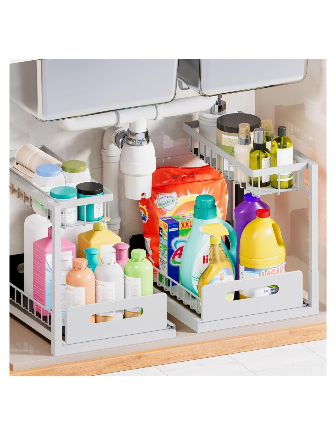 - Solución de Almacenamiento Deslizante Sin Esfuerzo Presentamos un organizador bajo fregadero revolucionario en forma de un cajón deslizante suave con mangos ergonómicos. Sácalo sin esfuerzo desde cualquier lado para acceder instantáneamente a tus esenciales almacenados. Este diseño revoluciona la forma en que organizas tu área bajo fregadero.