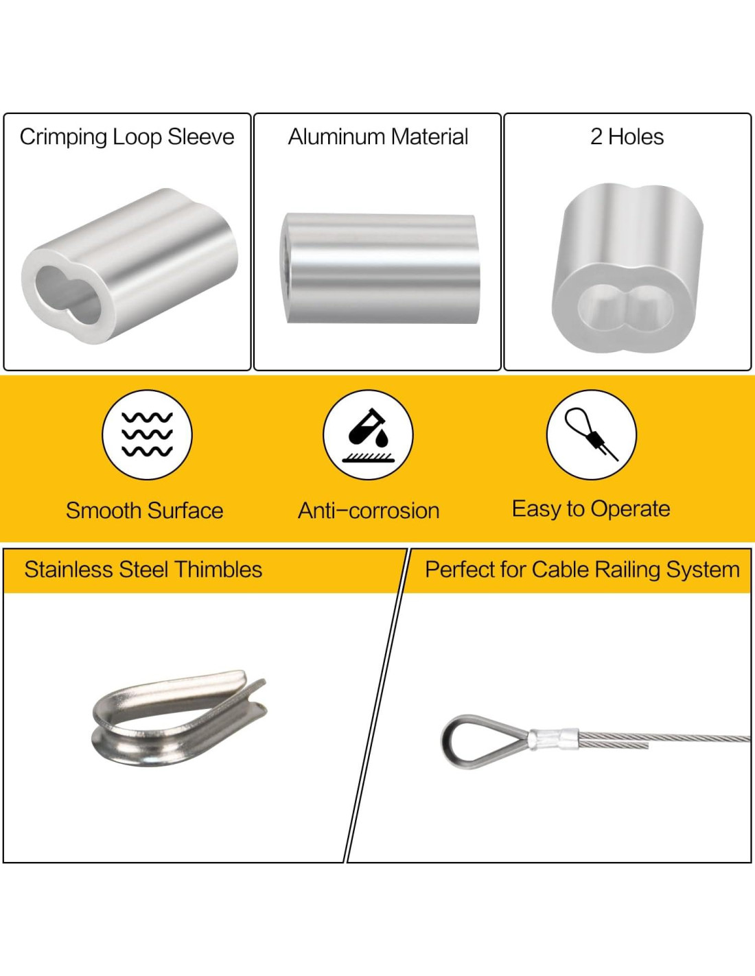 - [Fácil de Usar] - Solo necesitas insertar el cable en los manguitos y ojetes, luego usar herramientas de crimpado para asegurar los extremos de los manguitos del cable de alambre.