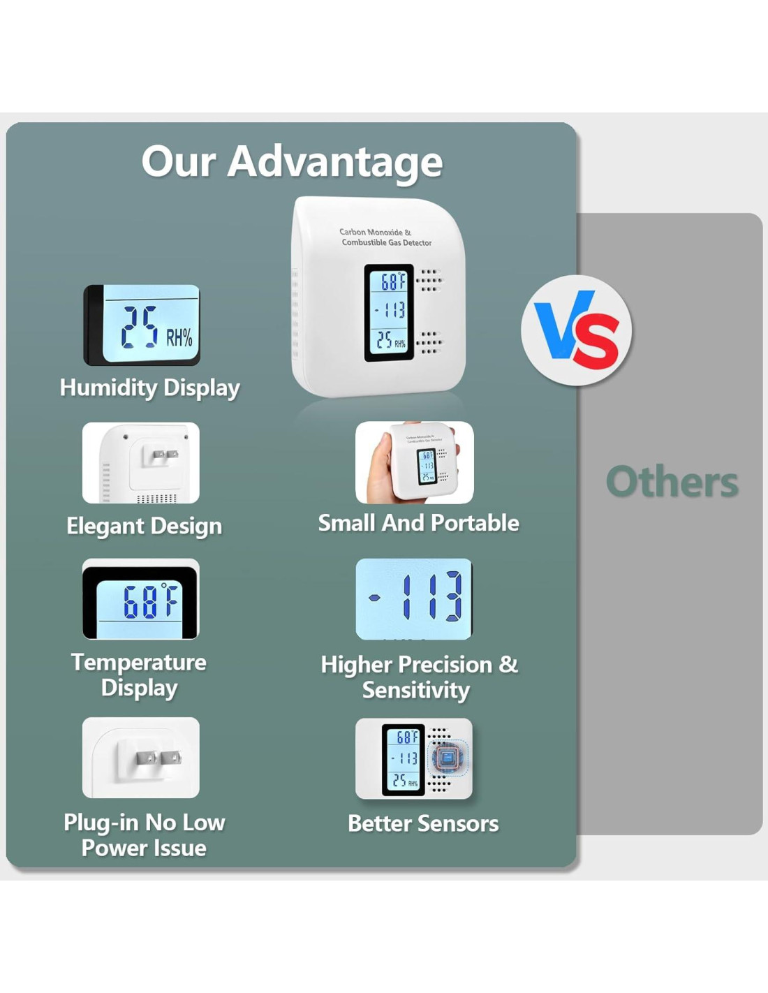 - Detección de Monóxido de Carbono y Gas 4 en 1: Elimina el desorden de detectores de un solo uso - nuestro detector de monóxido de carbono 4 en 1 se conecta y combina monitoreo de CO, gas natural, temperatura y humedad en un dispositivo compacto. Diseñado para hogares, apartamentos y viajes, ofrece protección todo en uno que ahorra espacio con la conveniencia de conectar y usar. La pantalla LED muestra niveles de PPM en tiempo real, brindándote información instantánea sobre las concentraciones de CO y gas.