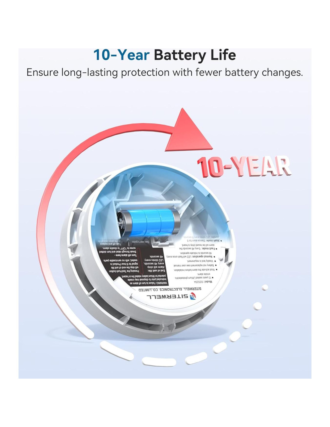 - Batería de 10 Años: La alarma de humo tiene una batería de litio de 3V incorporada, que dura 10 años y le recuerda cuando la batería está baja. Cuando la alarma envía una señal de fallo, debe reemplazar el producto inmediatamente.