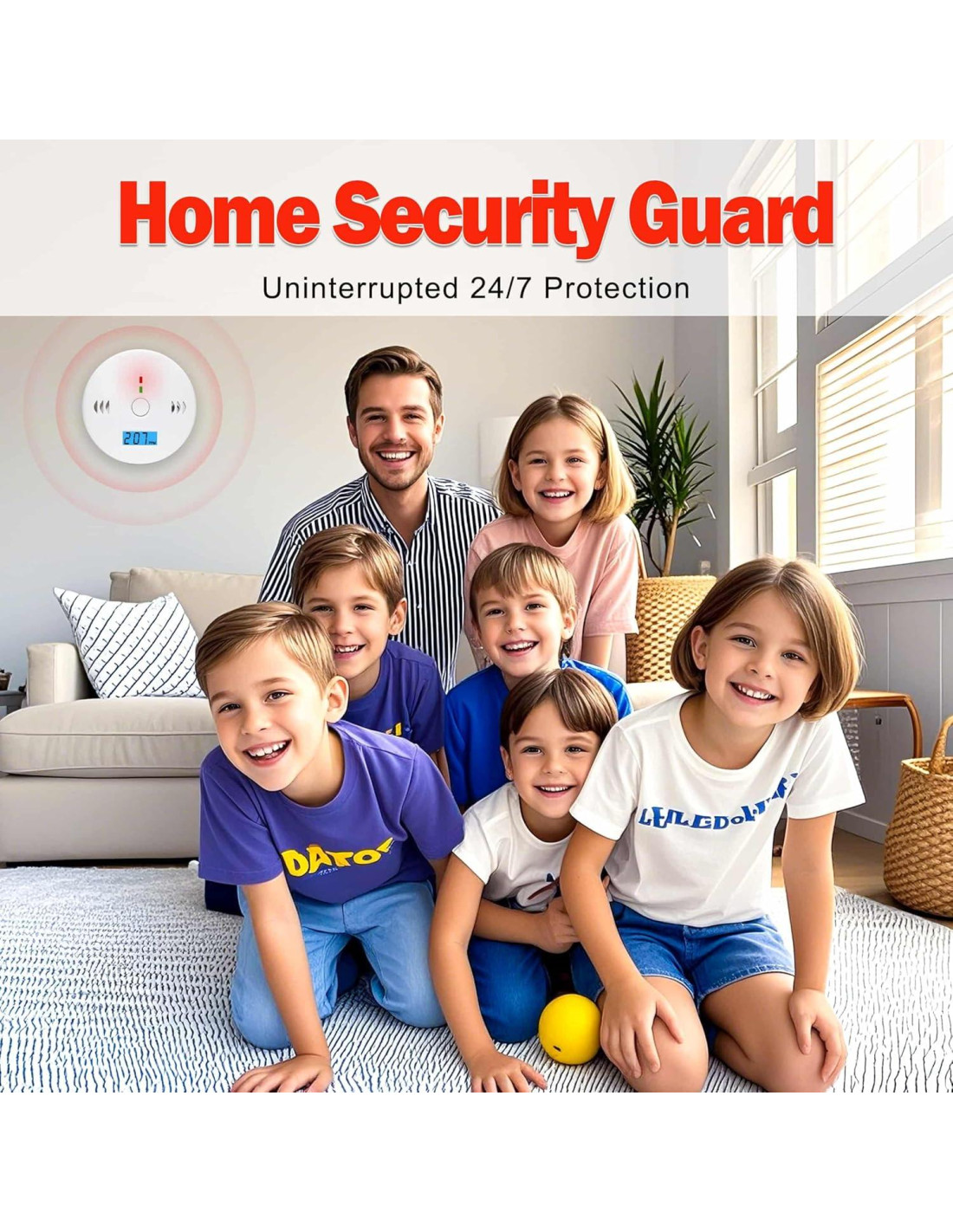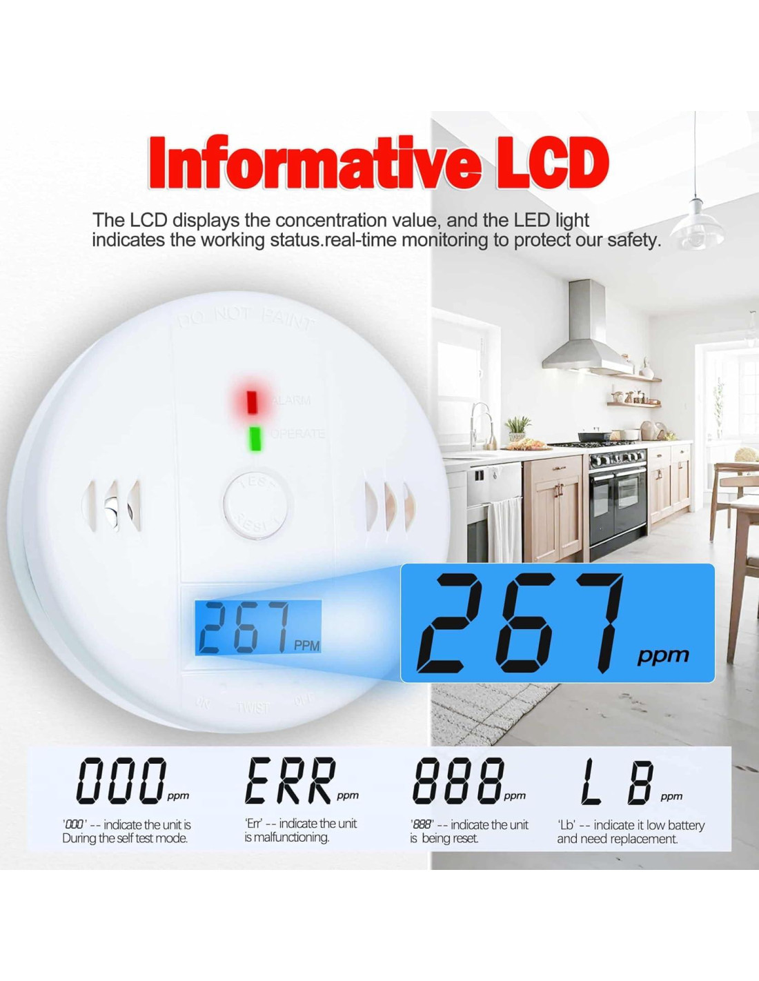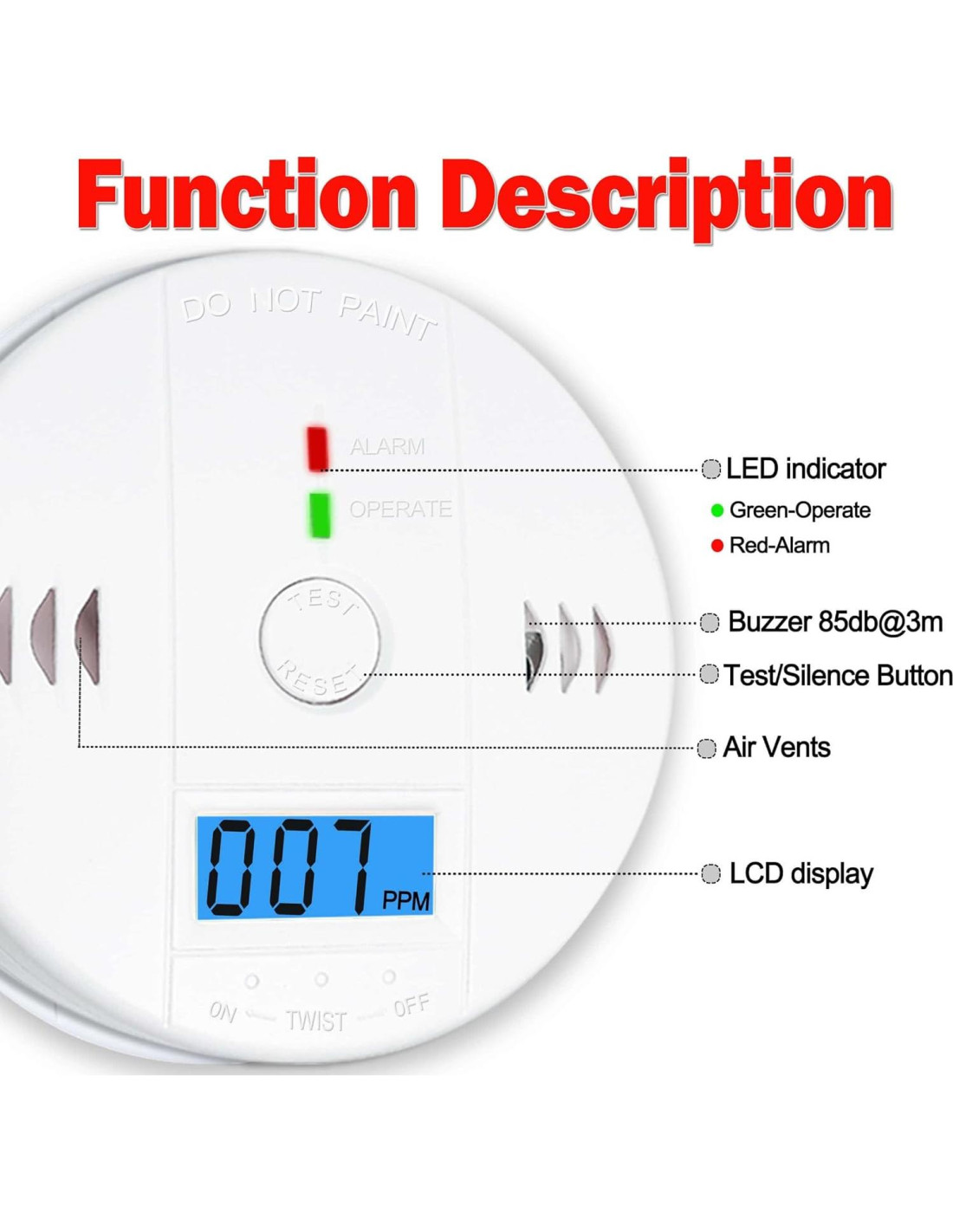 - Alerta instantánea: Cuando los detectores de monóxido de carbono alcanzan niveles de alarma, el sensor de CO detecta CO, el LED rojo parpadeará, la luz de fondo azul de la LCD se encenderá, se entregará una advertencia temprana a través de una fuerte alarma de 85 decibelios.