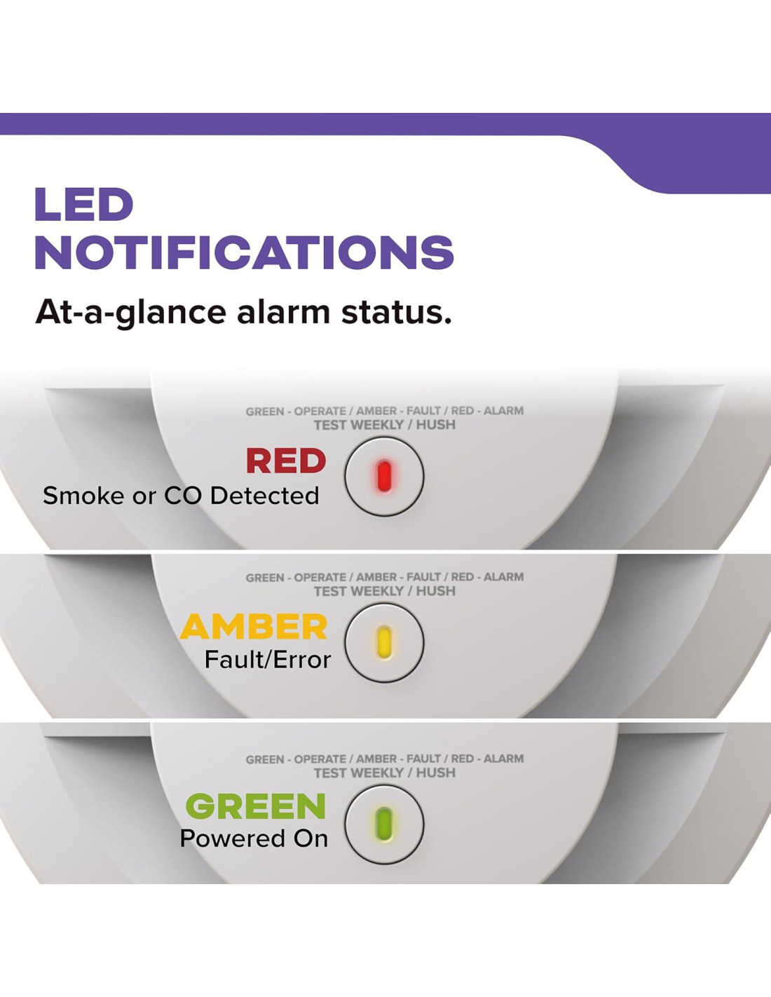 - 3 NOTIFICACIONES LED: Las luces LED indican el estado de la alarma, verde = operación normal, ámbar = error de operación, rojo = humo o monóxido de carbono detectado y sonará una alarma fuerte de 85 decibelios.