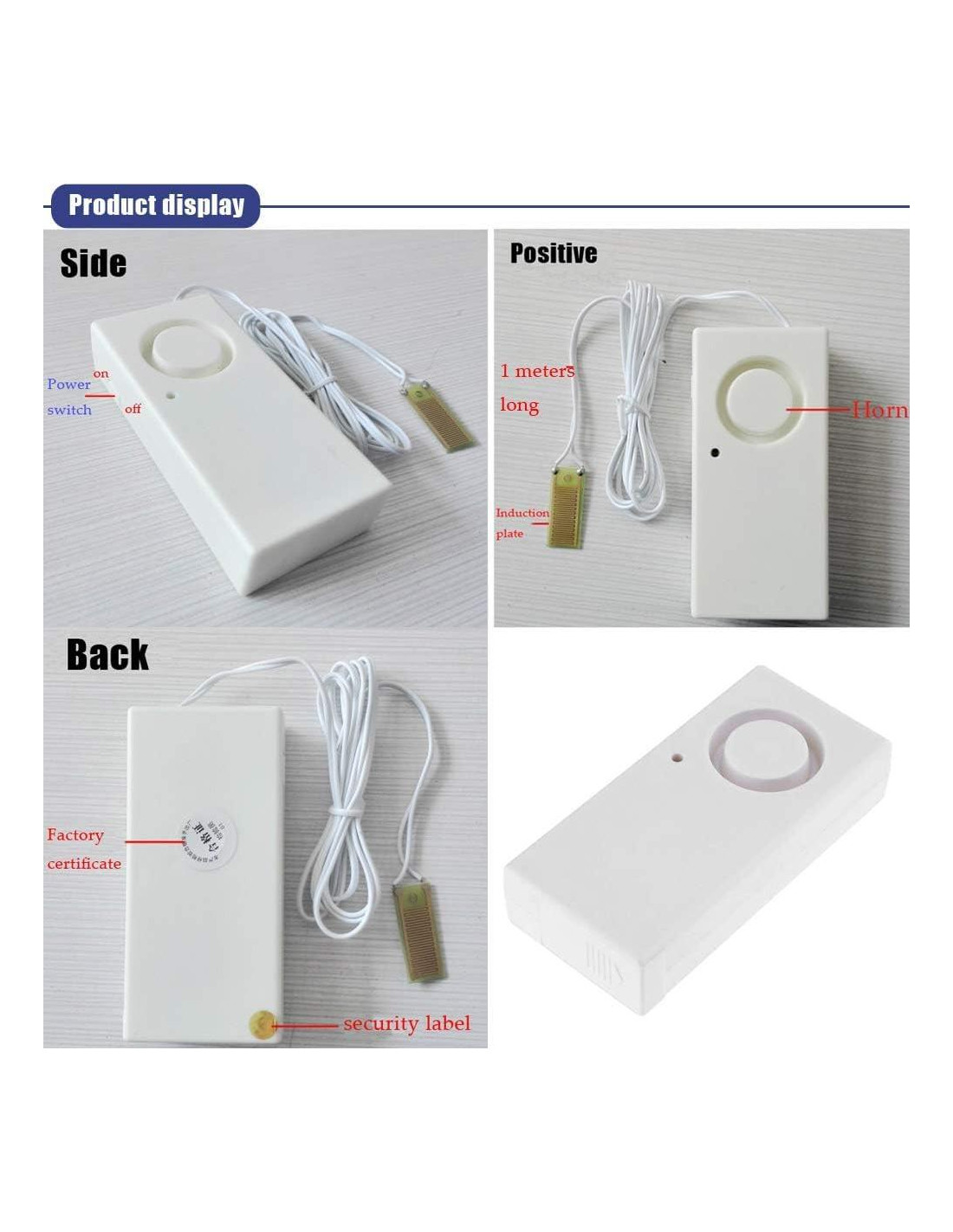 Ximimark 2Pcs Alarma de Fuga de Agua Detector de Nivel de Inundación para Bañera Fregadero Detección de Desbordamiento Sensor Alerta de Seguridad para Hogar Garaje Cocina 120db 120dB voz de alarma fuerte, mantiene la alarma para avisarte a ti o a los vecinos hasta que el agua se seque o el sensor se apague, alarma de fuga de agua de bajo costo y efectiva para prevenir daños por agua en tu hogar y negocio Placa de detección de 24k de alta sensibilidad, uso repetido después de secar la placa Etiqueta de doble cara (incluida) para fácil instalación en cualquier lugar Cable de 37.8 pulgadas (96,0 cm), fácil de extender más de 150 pies (45,72 m) de cable por el usuario (cable eléctrico normal disponible, no incluido), detecta agua en cualquier rincón Alimentado por batería de 9V (no incluida, se sugiere usar batería alcalina de marca), la vida útil de la batería será de aproximadamente 12 meses para uso normal (batería de baja calidad alrededor de 6 meses, alarma de frecuencia muy alta o pruebas, la vida útil de la batería será más corta) Descripción: Ximimark 2Pcs Alarma de Fuga de Agua Detector de Nivel de Inundación para Bañera Fregadero Detección de Desbordamiento Sensor Alerta de Seguridad para Hogar Garaje Cocina 120db Tamaño: como se muestra en la imagen Artículo 100% nuevo Nota: Agradecemos mucho todas las opiniones de los clientes para mejorar la venta, también si hay algo que no te satisface, por favor contáctanos para la mejor solución probable. ¡Gracias! Paquete Incluido: Ximimark 2Pcs Alarma de Fuga de Agua Detector de Nivel de Inundación para Bañera Fregadero Detección de Desbordamiento Sensor Alerta de Seguridad para Hogar Garaje Cocina 120db