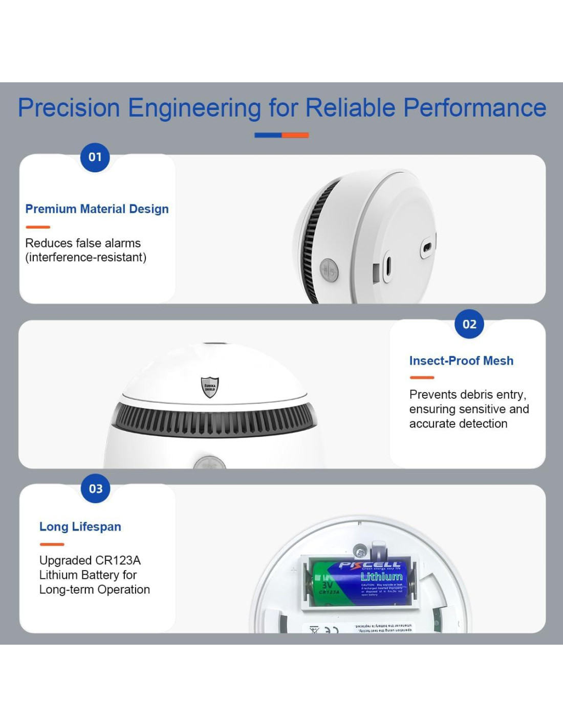 - [Batería de 10 Años y Gestión de Energía Inteligente] Equipado con una batería de litio CR123A reemplazable que ofrece 10 años de vida útil de la batería, ahorrando más de US$40. Presenta alertas de bajo consumo (con pitidos y destellos cada 60s), y un microchip con <0.5 mW de consumo ultra-bajo. El modo de sueño asegura protección 24/7 sin drenaje de energía, ideal para la seguridad de alarmas de humo en el hogar.