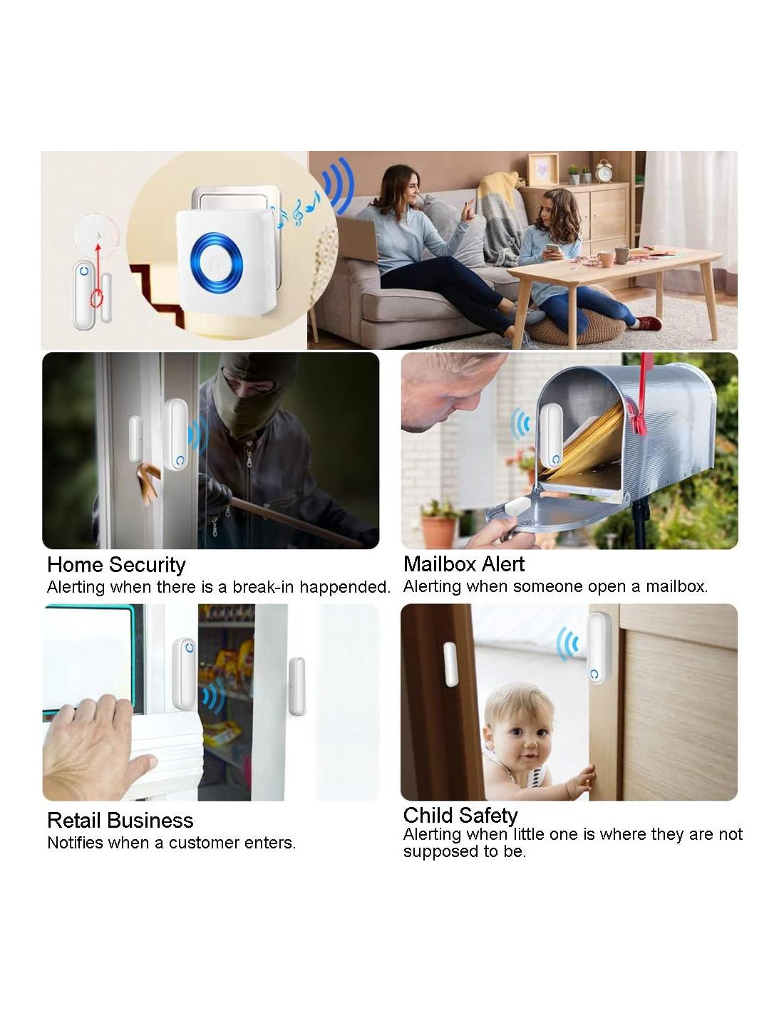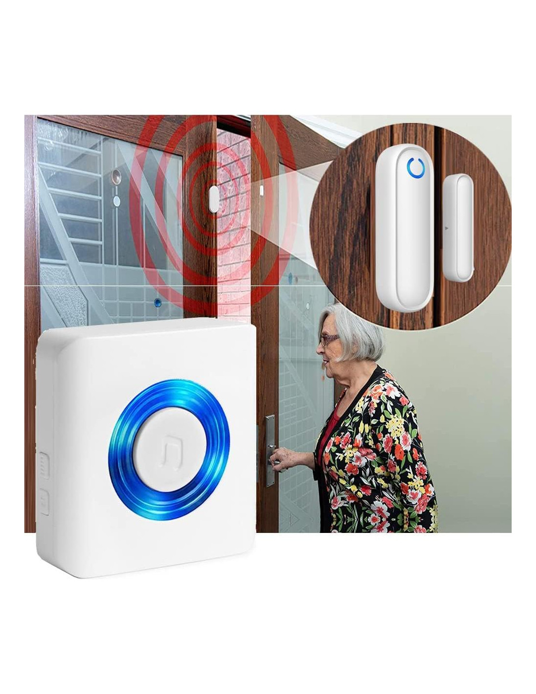- Mantén la seguridad de tu hogar/oficina: el timbre del sensor de puerta inalámbrico ofrece un área de detección generosa de casi 79 metros. Podrías escuchar el timbre de la puerta cuando los visitantes o invitados lleguen a tu hogar, tienda, oficina, etc. Suena para notificarte que alguien entra, o alertarte de un intruso que intenta entrar en tu hogar. O recordarte cuando tus niños/Pacientes Ancianos con Demencia abren la puerta/ventana y se escapan.