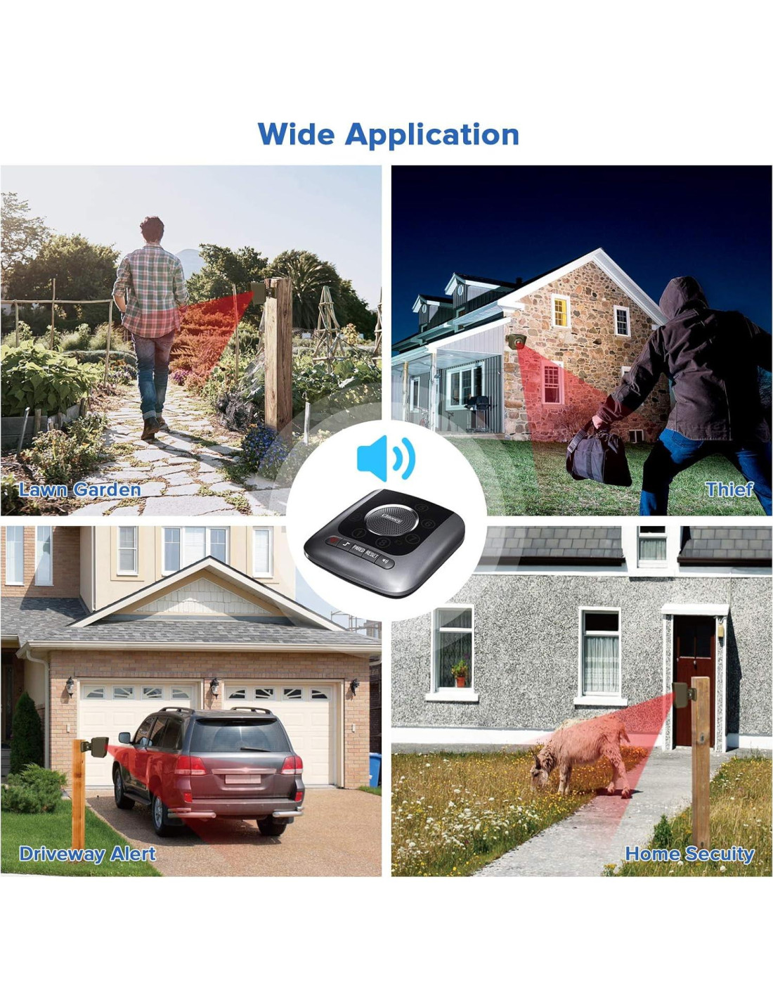 - 3 Niveles de Sensibilidad y Alertas Personalizadas: Con 3 niveles de sensibilidad ajustables y un ancho de detección de hasta 33 pies (10.06 metros), se minimizan las falsas alarmas. Elige entre 12 melodías, 4 configuraciones de volumen (incluido el modo silencio) y alertas de destello LED en el receptor para notificaciones precisas, de día o de noche.