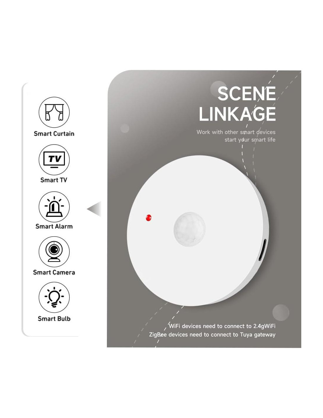 - [Vinculación de Escenas] Usa la App Smart Life/TUYA para crear programas de escena favoritos, cuando detecte movimiento en la escena establecida, activará la tarea correspondiente, como "alguien pasa" "la luz inteligente tuya se enciende automáticamente", cuando llegues a casa, el sensor de movimiento humano WiFi detecta el movimiento y la luz se enciende automáticamente, para lograr la vinculación de escenas, ayudando a la realización de una vida inteligente.
