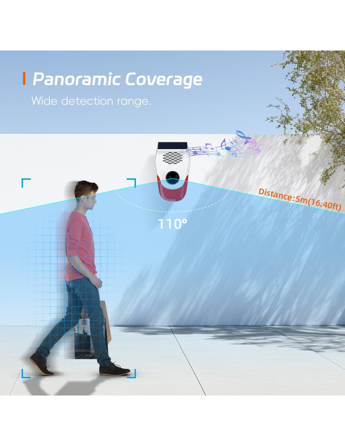 - Sonidos Grabados Reemplazables: La alarma de detección de movimiento solar incluye 8 sonidos como disparos, sonido de advertencia y ladrido de perro. Personalícelo con hasta 8 de sus propios sonidos a través de la computadora; EL TAMAÑO DEL ARCHIVO DE AUDIO DEBE SER MENOR A 1.3 MB