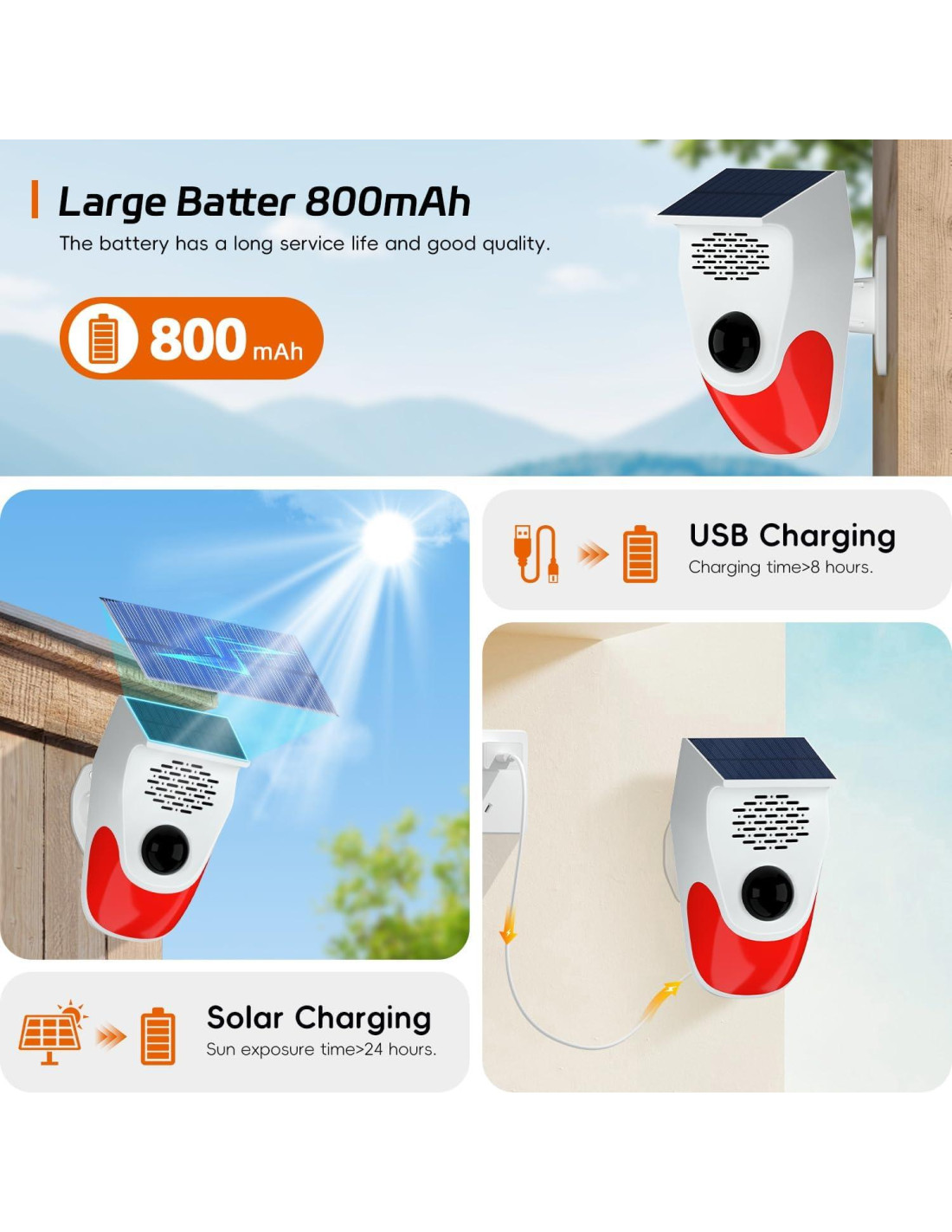 - Tres Fuentes de Energía: Esta alarma de detección de movimiento está equipada con una batería de litio de alta capacidad de 1000mAh, soporta energía solar y carga USB, ya sea al aire libre o en interiores puede estar en línea en cualquier momento, 24 horas al día para proteger su seguridad