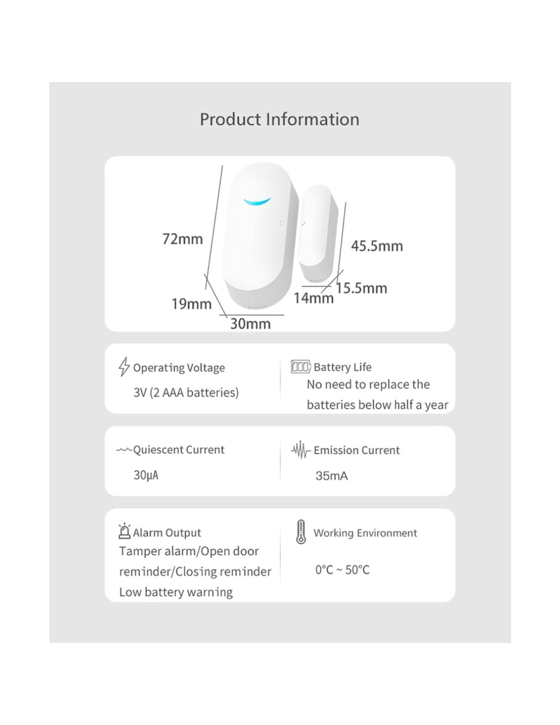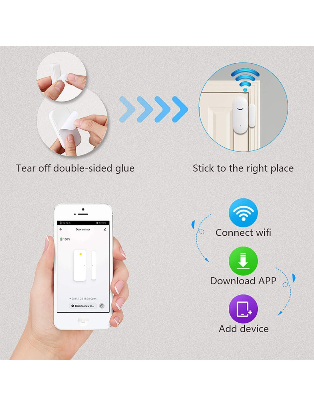- [Fácil Instalación] No se requieren herramientas de instalación complicadas. Desplázate hacia abajo para encontrar el video en la página principal sobre cómo agregar el sensor a WIFI y Alexa. Sensor de puerta de bajo consumo energético, vida útil de la batería super larga evita reemplazos frecuentes.