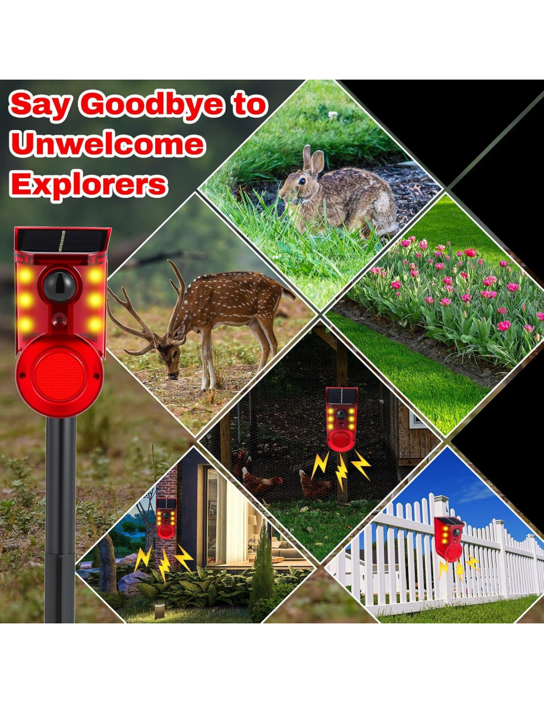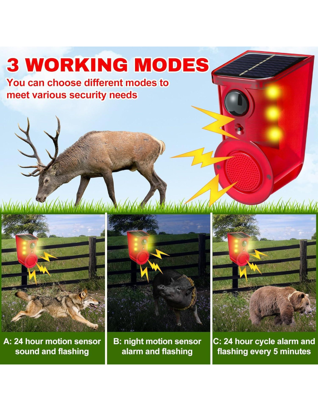 Características: Solar y USB aseguran un funcionamiento confiable 24/7 - ideal para uso durante todo el año sin reemplazos de batería en granjas, establos, jardines y más. Cuenta con 3 modos de alerta, alarma de 129dB y luces LED - ahuyenta animales o intrusos. Fácil instalación con estacas o montajes para protección exterior flexible. Especificaciones: Material: plástico Color principal: rojo El paquete incluye: 4 x Alarmas de movimiento solar con estacas Notas: Medición manual, por favor permita ligeros errores en el tamaño. El color puede tener una ligera diferencia debido a diferentes pantallas. La vida útil de la batería está relacionada con la frecuencia y duración del uso del producto. Si la frecuencia de uso es alta y el uso único es largo, la vida útil de la batería será relativamente corta.