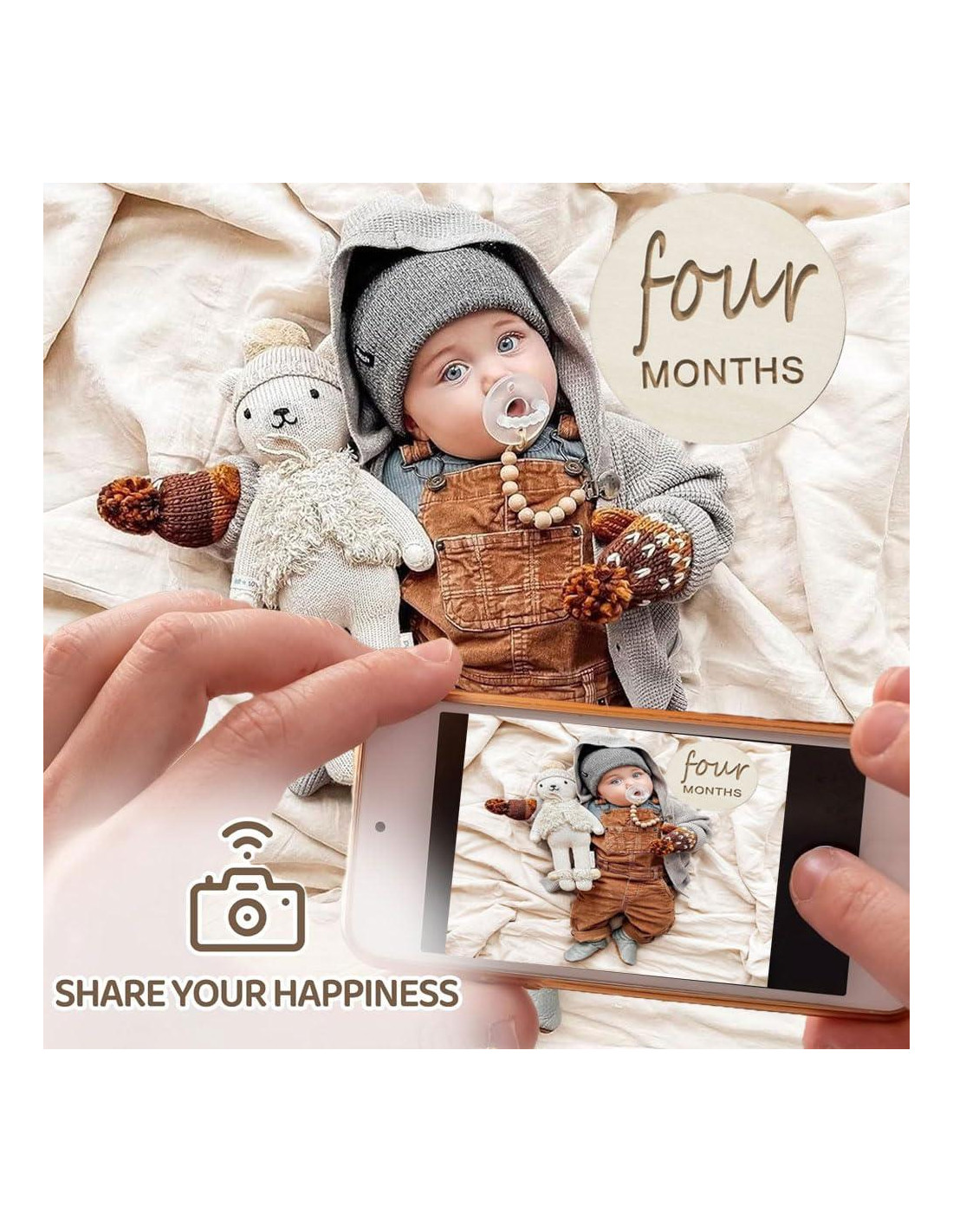 - Valora el Progreso de Tu Bebé: Los hitos mensuales del conjunto de regalos para bebés son invaluables para preservar recuerdos. A lo largo del primer año de tu bebé, cada mes puede ser documentado, capturando su crecimiento en diferentes etapas, por ejemplo, la primera sonrisa, aprender a rodar o intentar ponerse de pie, estos momentos preciosos quedarán inmortalizados para siempre en estos círculos de hito de madera especiales.
