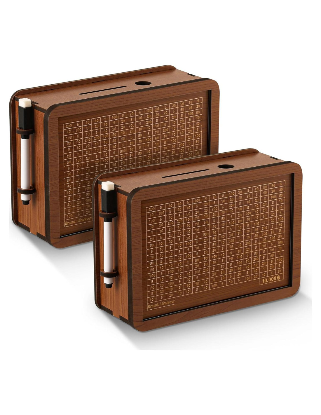- Objetivo de Ahorro $10000: La placa del vault de dinero de madera de 10k está impresa con números, que están claramente numerados y marcados. Para alcanzar el objetivo de $10,000. Puedes tachar los números correspondientes después de cada depósito. Cuando todos los cuadros de la caja de ahorro estén tachados, habrás alcanzado tu objetivo. El bolígrafo borrable está fijado y no es fácil de perder.
