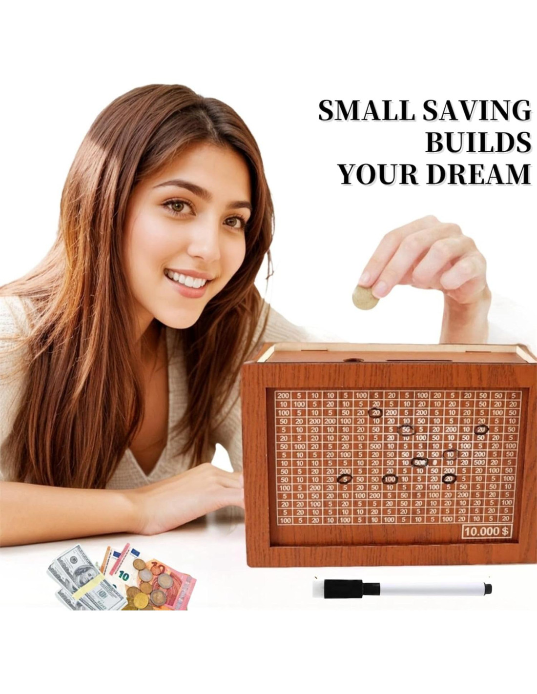 - [Meta de Ahorro $10000] : El panel de nuestra caja de dinero de madera presenta números claramente marcados. Para alcanzar la meta de $10,000, simplemente deposita la cantidad designada y tacha la cifra correspondiente en el panel. Una vez que todos los números estén tachados, ¡has alcanzado tu meta!