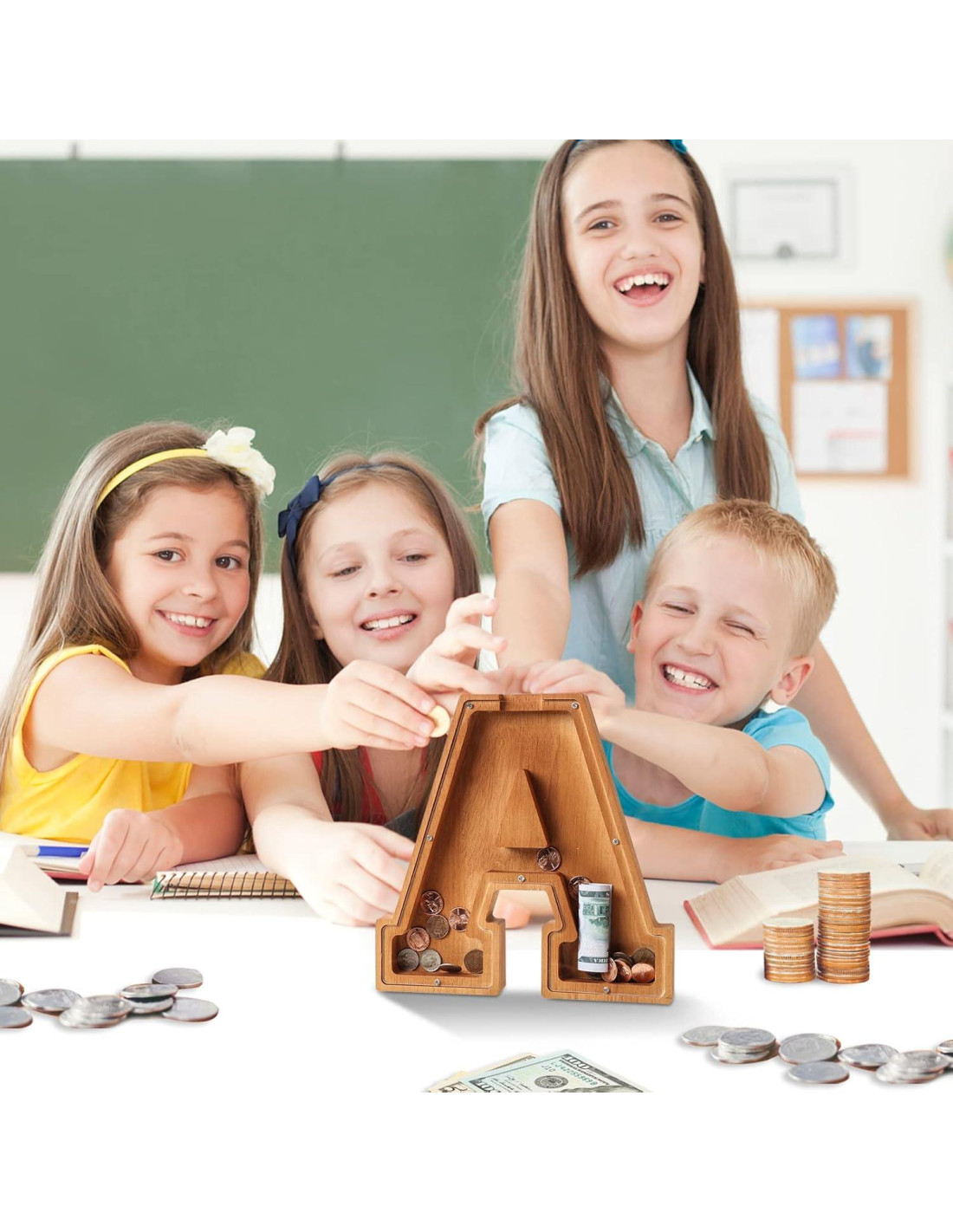 - Nuevo Diseño Único Mejorado- Rediseñamos este lindo banco de dinero de 26 letras para hacer que tu banco de ahorros sea único. El banco de dinero grande de 9.1 pulgadas (23.1 cm) está hecho de madera natural de alta calidad y ecológica y vidrio acrílico transparente de moda. Es muy seguro de usar. El pulido cuidadoso a mano crea un toque suave y delicado. Nunca te preocupes de que el frasco de monedas lastime las manos de los niños. Con una tapa de acrílico, los niños pueden ver claramente cuánto les falta para llenarlo y disfrutar de la felicidad de su crecimiento en el ahorro.