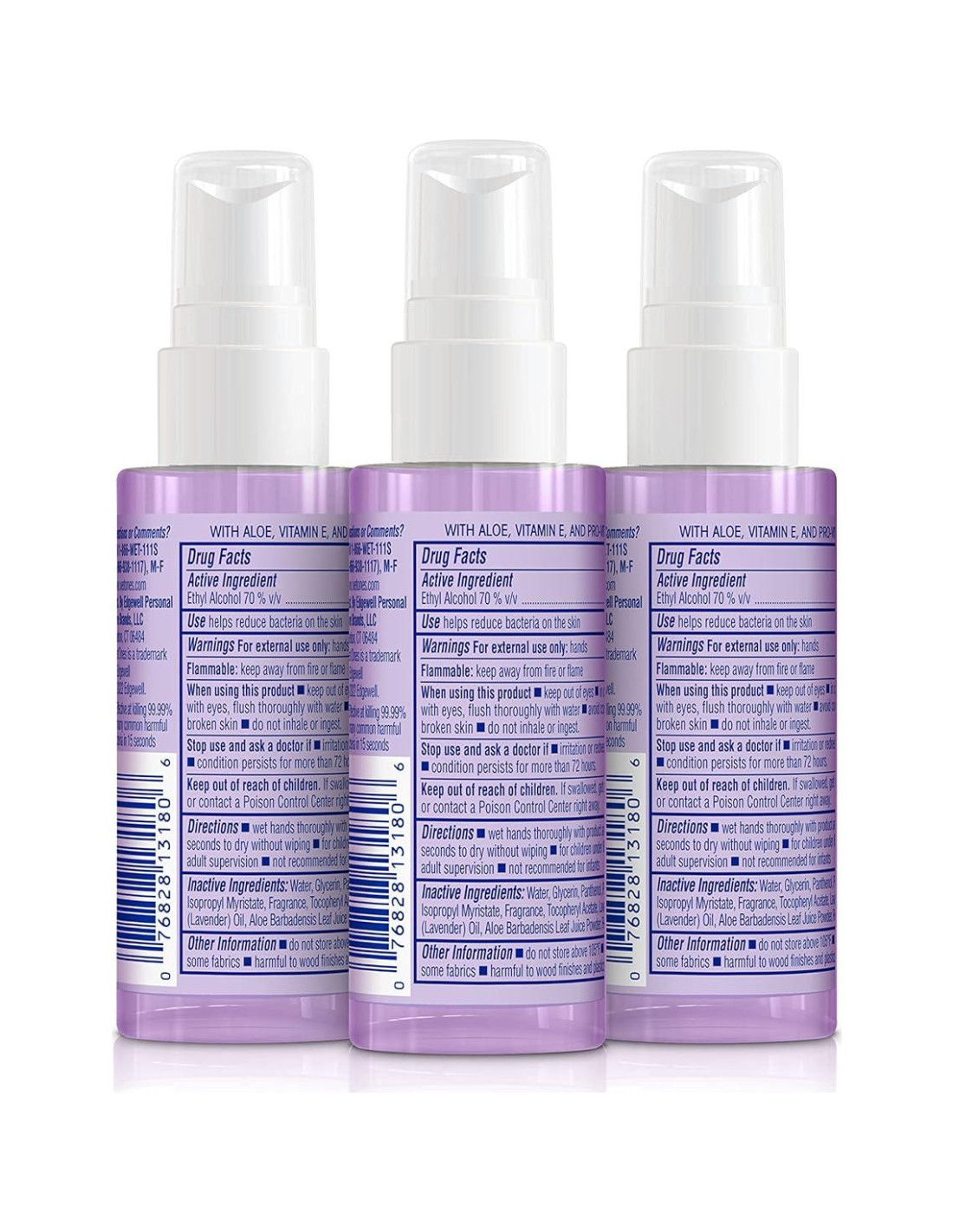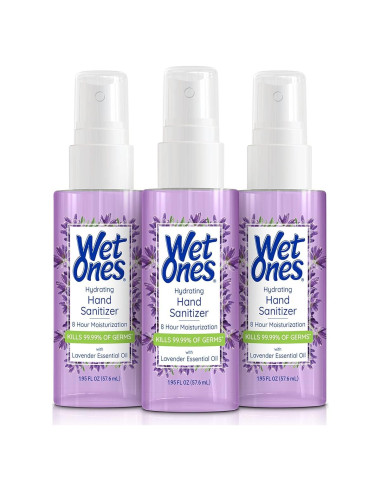 El Spray Hidratante Desinfectante de Manos Wet Ones presenta una fórmula ligera que proporciona 8 horas de hidratación, mata el 99.99% de los gérmenes y deja las manos frescas, suaves y lisas-nunca pegajosas. El Spray Desinfectante de Manos Wet Ones está hecho con aceite esencial de lavanda, aloe, vitamina E y pro-vitamina B5. Este desinfectante de manos portátil es hipoalergénico, libre de parabenos y probado por dermatólogos.