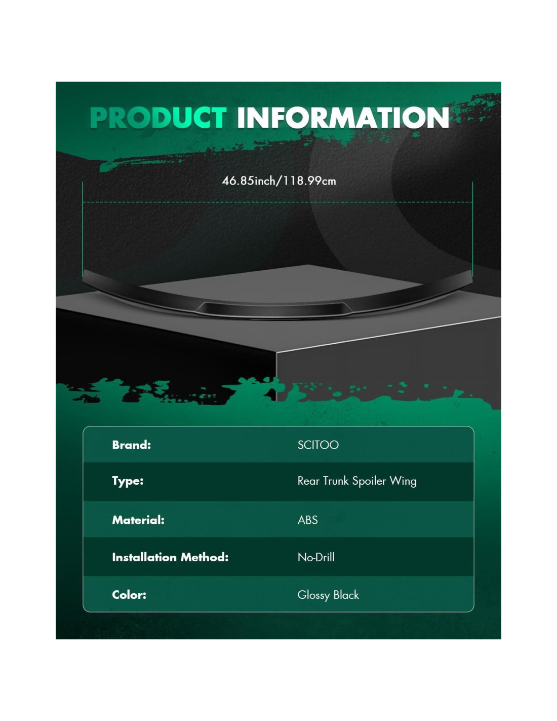 - Materiales de calidad - Este alerón trasero de maletero está hecho de plástico ABS con una superficie pulida y un recubrimiento transparente. No solo tiene una apariencia hermosa, sino que también es resistente y duradero. Capaz de soportar la exposición a las inclemencias del tiempo sin daños.