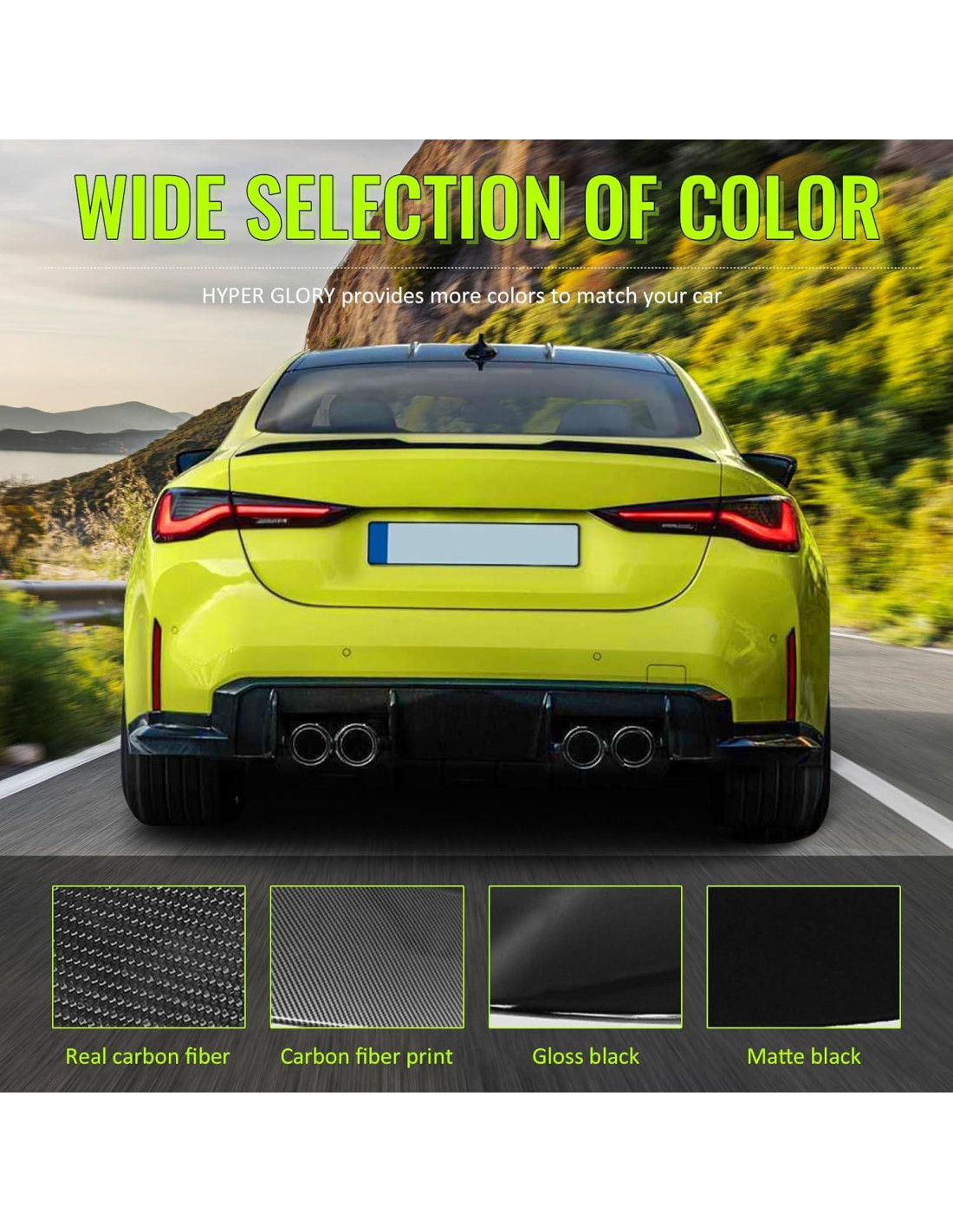 - Material premium: Alerón trasero de alta calidad fabricado con fibra de carbono real (CF) resistente a impactos y con estructura reforzada, puede soportar rayos UV, corrosión y temperaturas extremas mientras mantiene un acabado brillante.