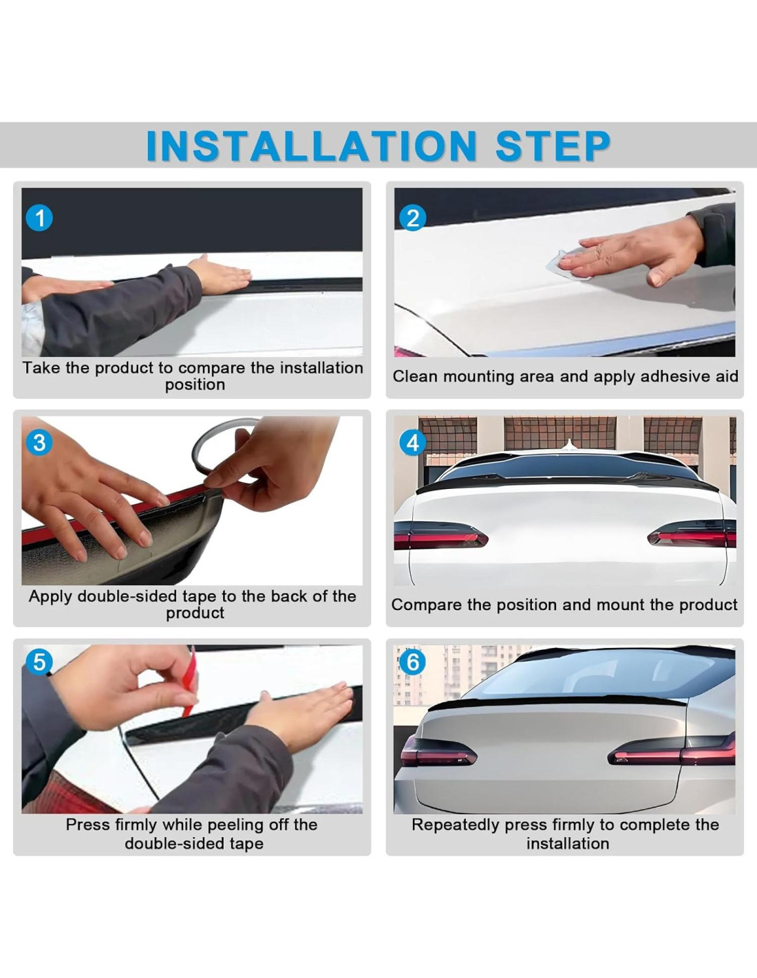 - Instalación Sin Complicaciones: No se requiere perforación ni corte. El alerón negro brillante para G02 es para una instalación sencilla de bricolaje. 1. Use una toalla limpia para limpiar el área de montaje 2. Mida y marque la ubicación a instalar 3. Después de que la ubicación sea correcta, retire la cinta de doble cara e instálelo mientras presiona 4. Después de la instalación, puede presionar nuevamente para hacer que el alerón trasero se ajuste más firmemente
