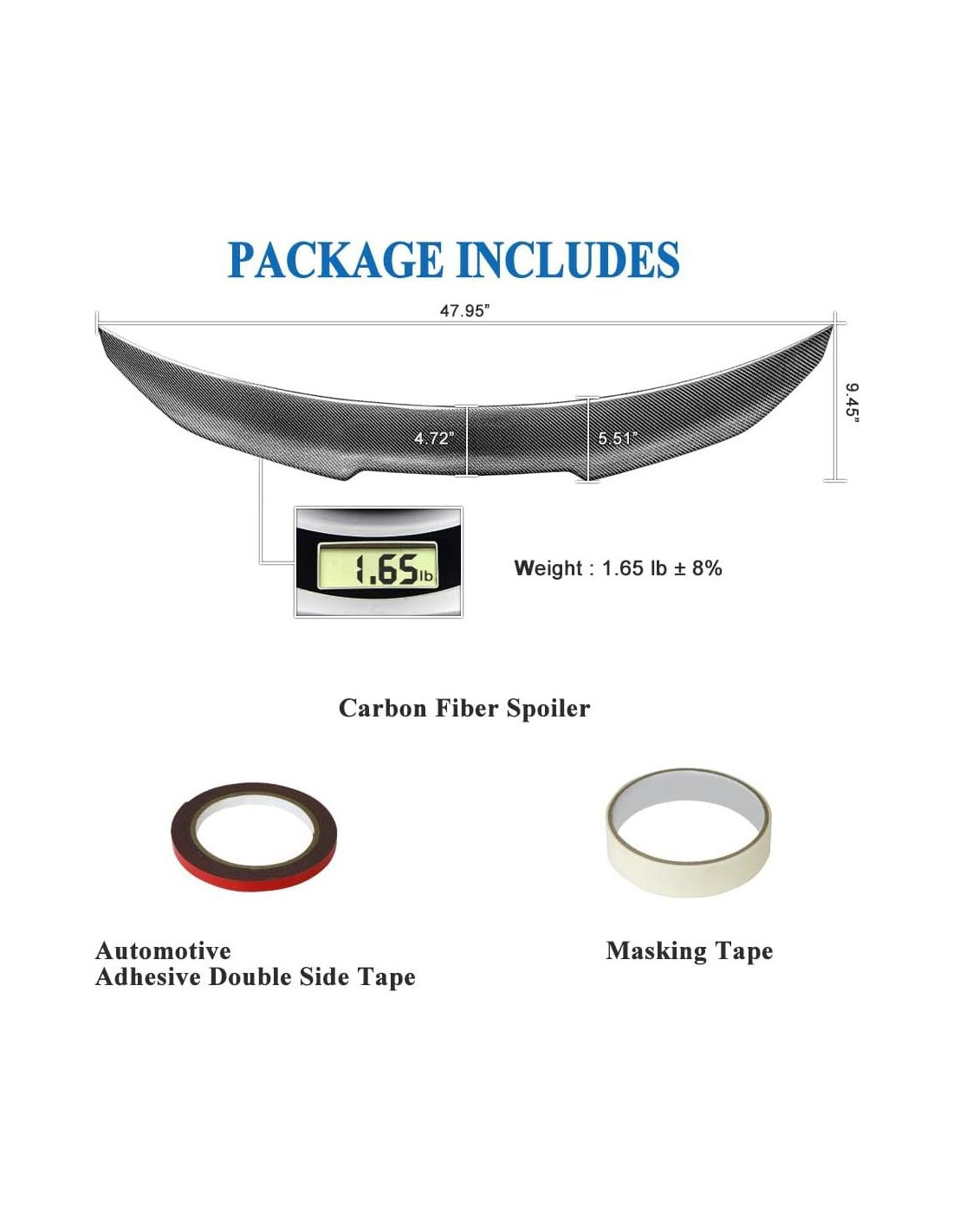 - Fácil instalación: ¡No se requieren perforaciones ni modificaciones! Este alerón trasero de fibra de carbono se instala sin esfuerzo utilizando la cinta adhesiva automotriz de alta resistencia incluida, asegurando un agarre firme y duradero.