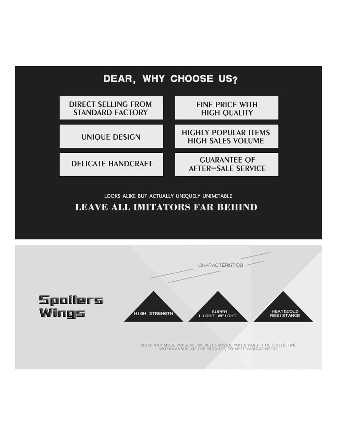 - DISEÑO DELICADO: El acabado del alerón está recubierto con polvo negro que resiste el desgaste. Como parte del vehículo, el alerón bloqueará la lluvia exterior