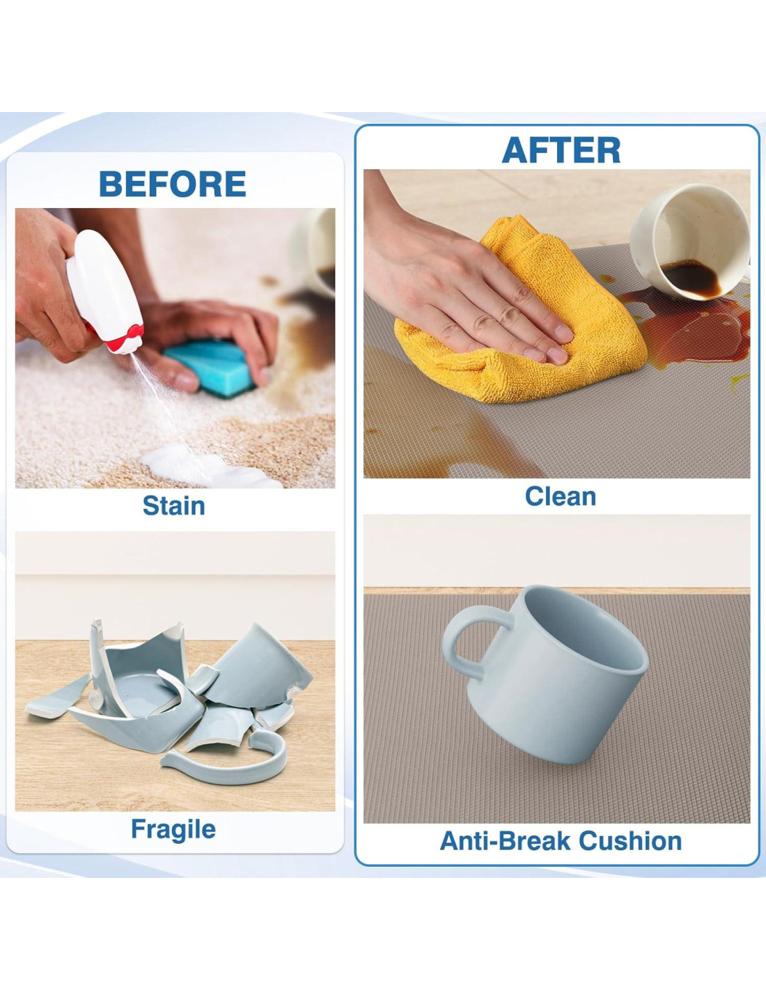 - Resistente a Manchas: Nuestras alfombrillas de cocina tienen una textura resistente a manchas que facilita la limpieza. Ya sea agua, vino u otros derrames, puedes limpiar fácilmente la alfombrilla con un paño o trapo húmedo