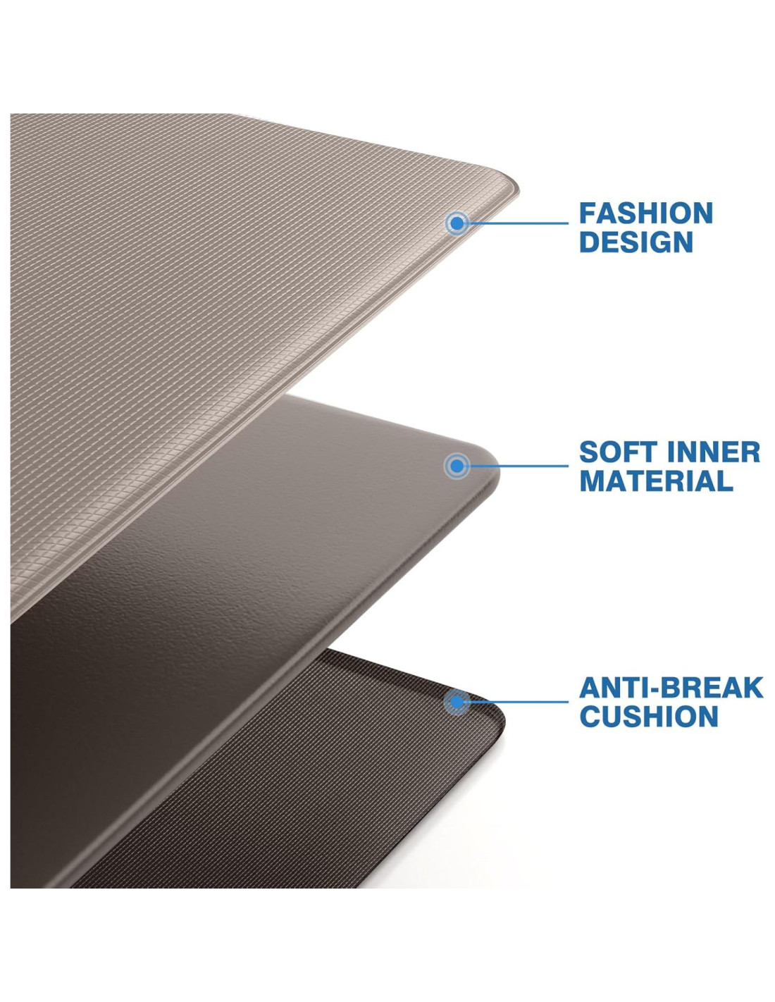 - Material Confiable: Las alfombrillas de cocina StepRite están fabricadas con material de primera calidad que mantiene su forma y soporte con el tiempo, asegurando un rendimiento duradero sin deterioro