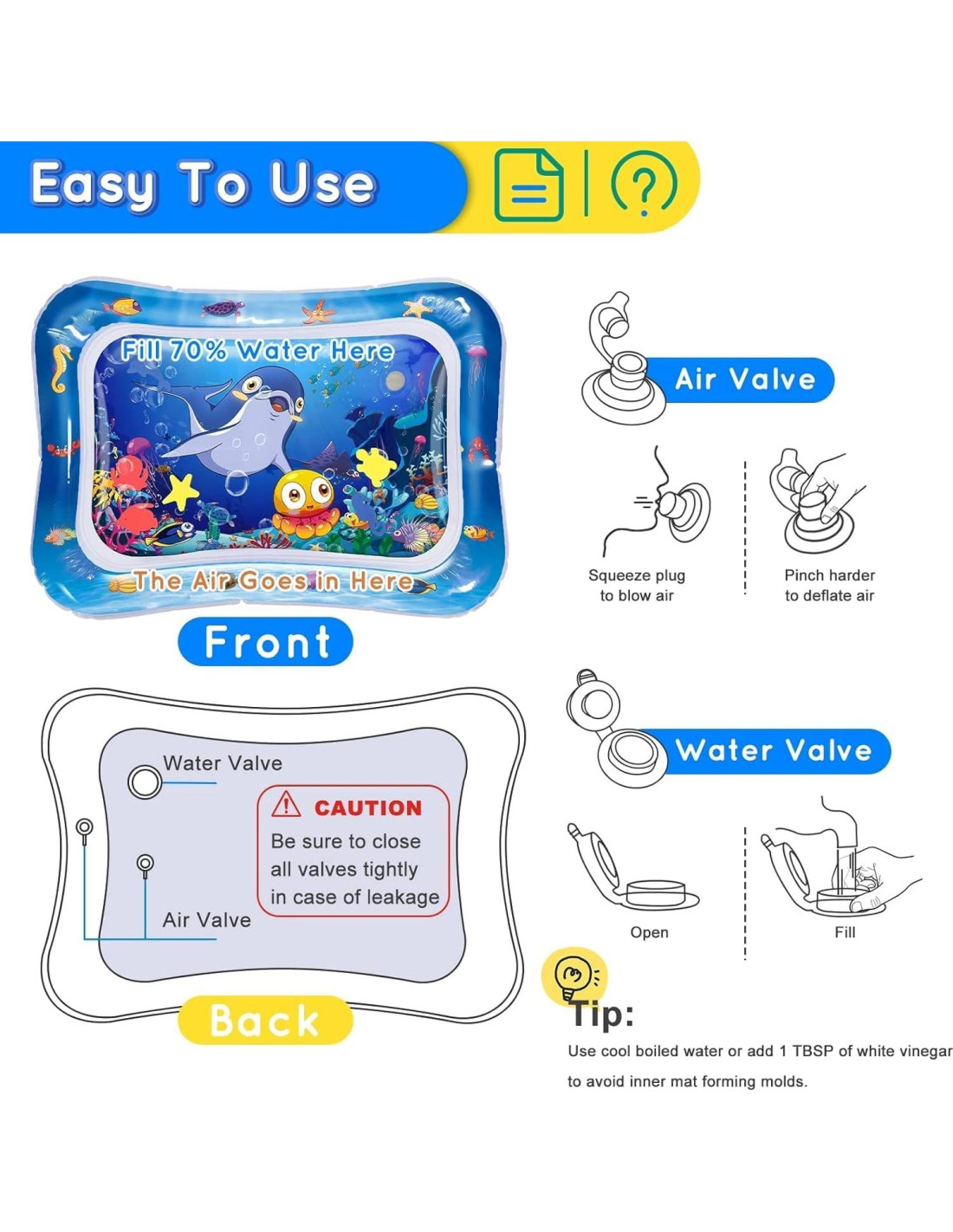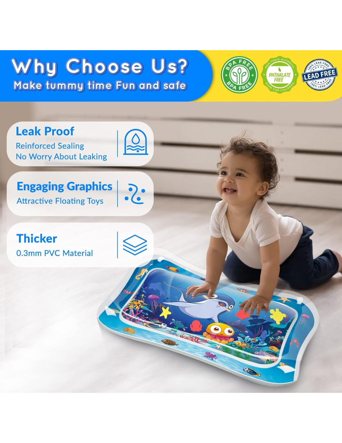 - Calidad Suprema y Uso de Material Mejorado: La alfombra de agua para bebés está hecha de PVC resistente, 100% libre de BPA y no tóxico que adopta material ecológico mejorado. Cada una de nuestras alfombrillas de juego ha sido rigurosamente probada y no tendrá fugas de aire o agua. Certificada por CPC, aprobada por ASTM.