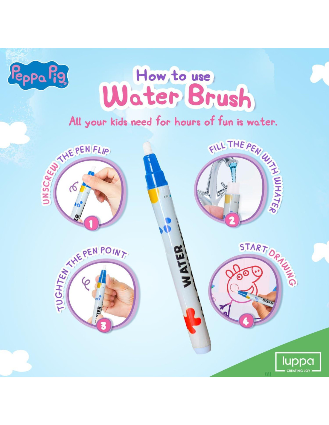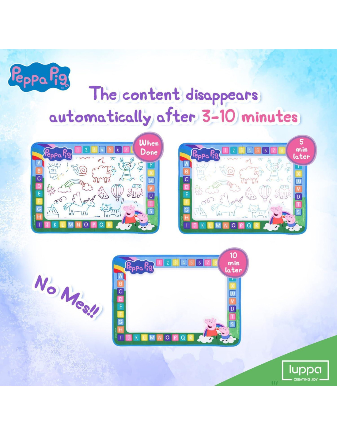 - Desata la creatividad de tu hijo con una experiencia de dibujo sin desorden en nuestra Alfombra de Dibujo de Agua de Peppa Pig. ¡Perfecta para colorear y dibujar sin desorden para los niños!
