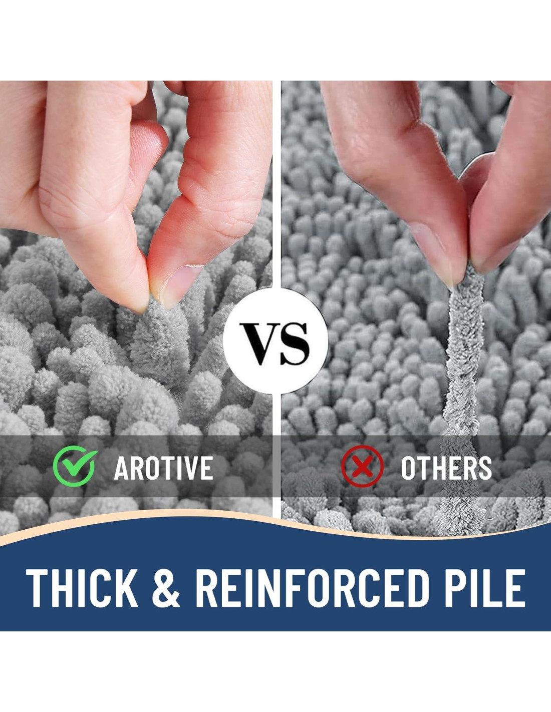 - Base antideslizante: Las alfombras de baño de chenilla Arotive cuentan con una parte inferior antideslizante compuesta de un material de malla de PVC resistente que evita que la alfombra se desplace y resbale. La capa intermedia es de 4 mm de espuma viscoelástica, lo que te permite sentirte más cómodo al envolverte en las alfombras. ADVERTENCIA: Coloca la alfombra de baño sobre un SUELO LIMPIO, SECO Y PLANO SOLAMENTE. El agua debajo de la alfombra de baño puede hacer que se deslice. Siempre mantén la parte inferior de la alfombra de baño seca.