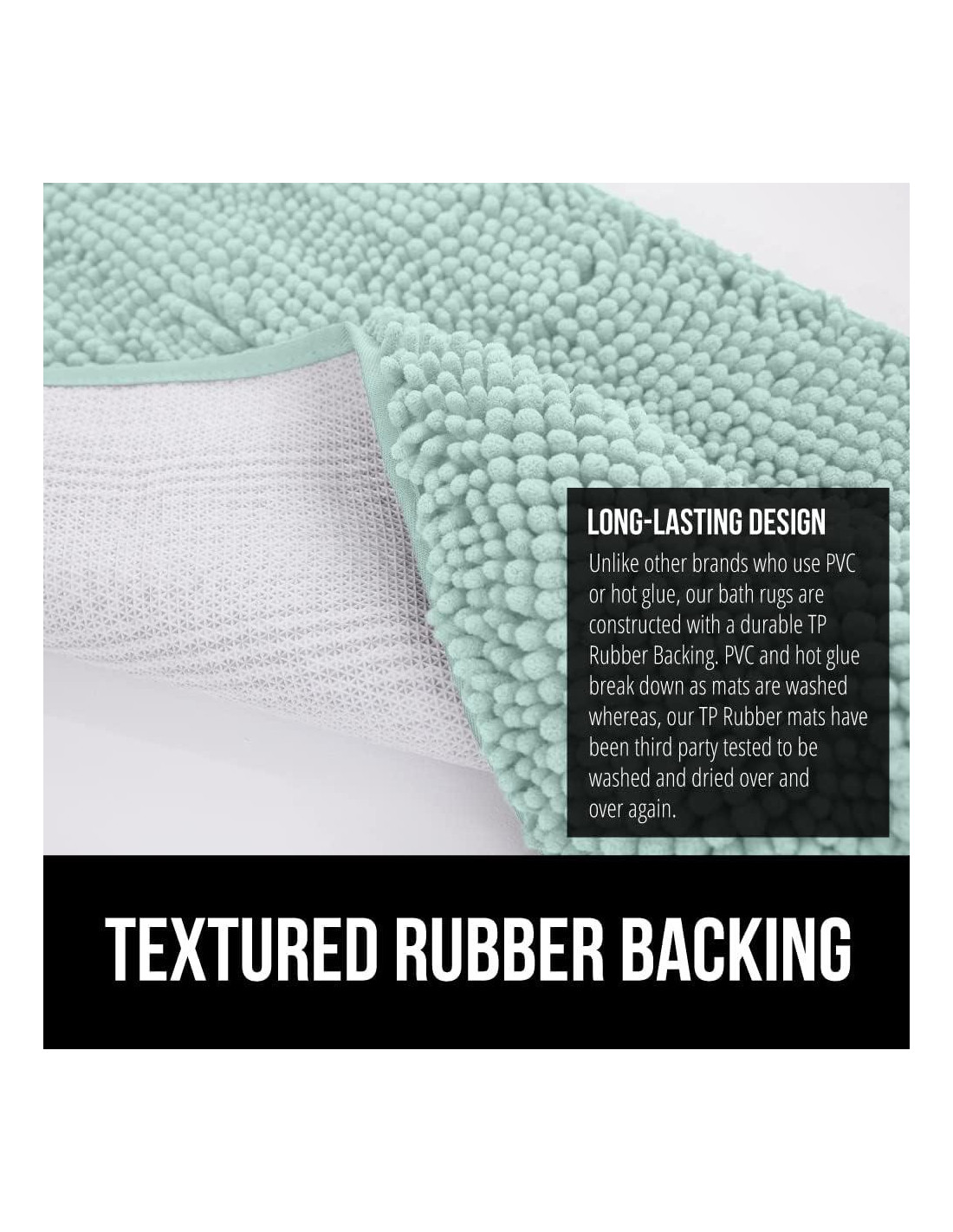 - RESPALDO DE GOMA TEXTURIZADO: a diferencia de otras marcas que usan PVC o pegamento caliente, nuestras alfombrillas de baño están construidas con un respaldo de goma TP duradero. El PVC y el pegamento caliente se descomponen a medida que las alfombrillas se lavan, mientras que nuestras alfombrillas de goma TP han sido probadas por terceros para ser lavadas y secadas una y otra vez para un uso duradero.